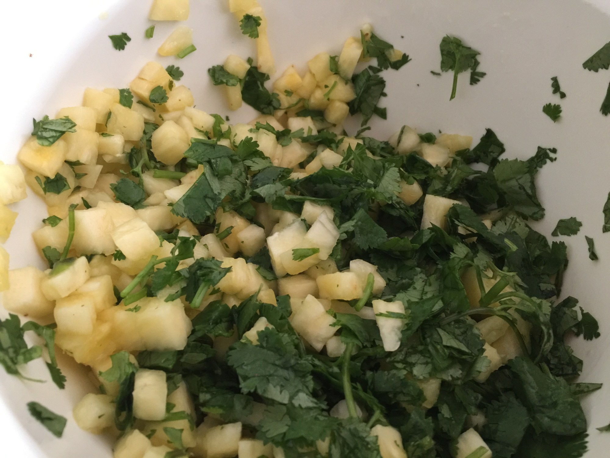 Dans un bol, mélanger l’ananas, la coriandre et le poivre et laisser mariner 1 heure au frigo.