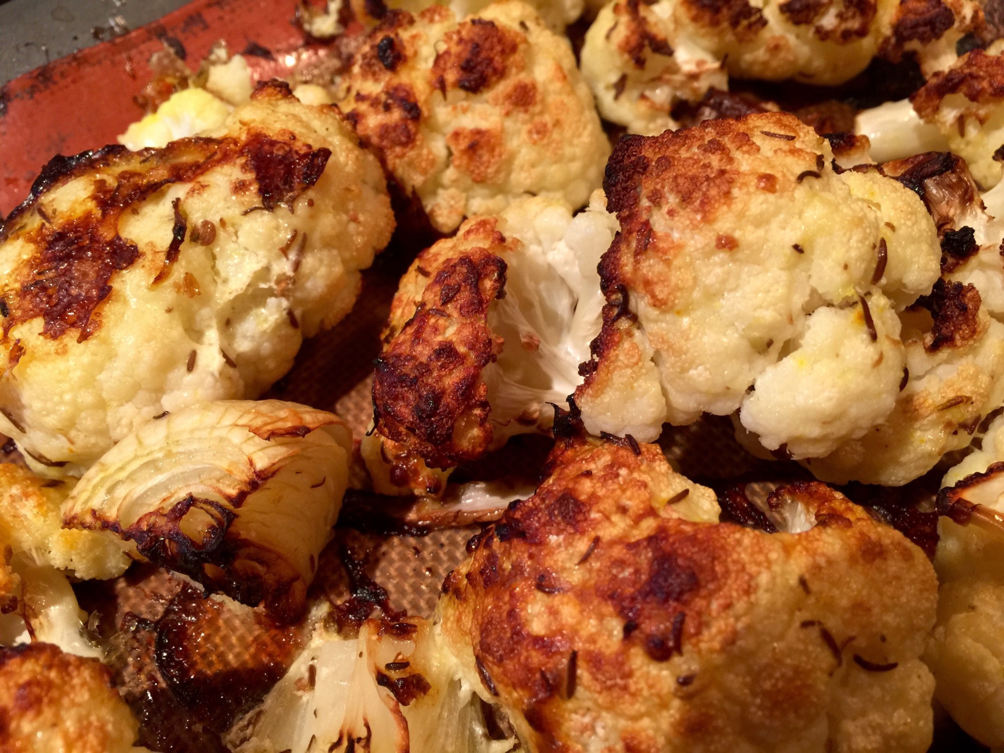 Préchauffer le four à 450F. Mélanger le chou-fleur défait en bouquet avec les épices et l’huile d’olive. Cuire au four durant 25 minutes.