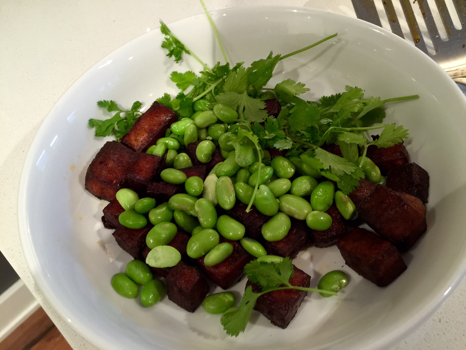 6. Dans un grand bol, disposer les edamames et la coriandre, ajouter le tofu croustillant, arroser de la moitié de la vinaigrette et saupoudrer de graines de sésame. Servir immédiatement accompagné du reste de vinaigrette.