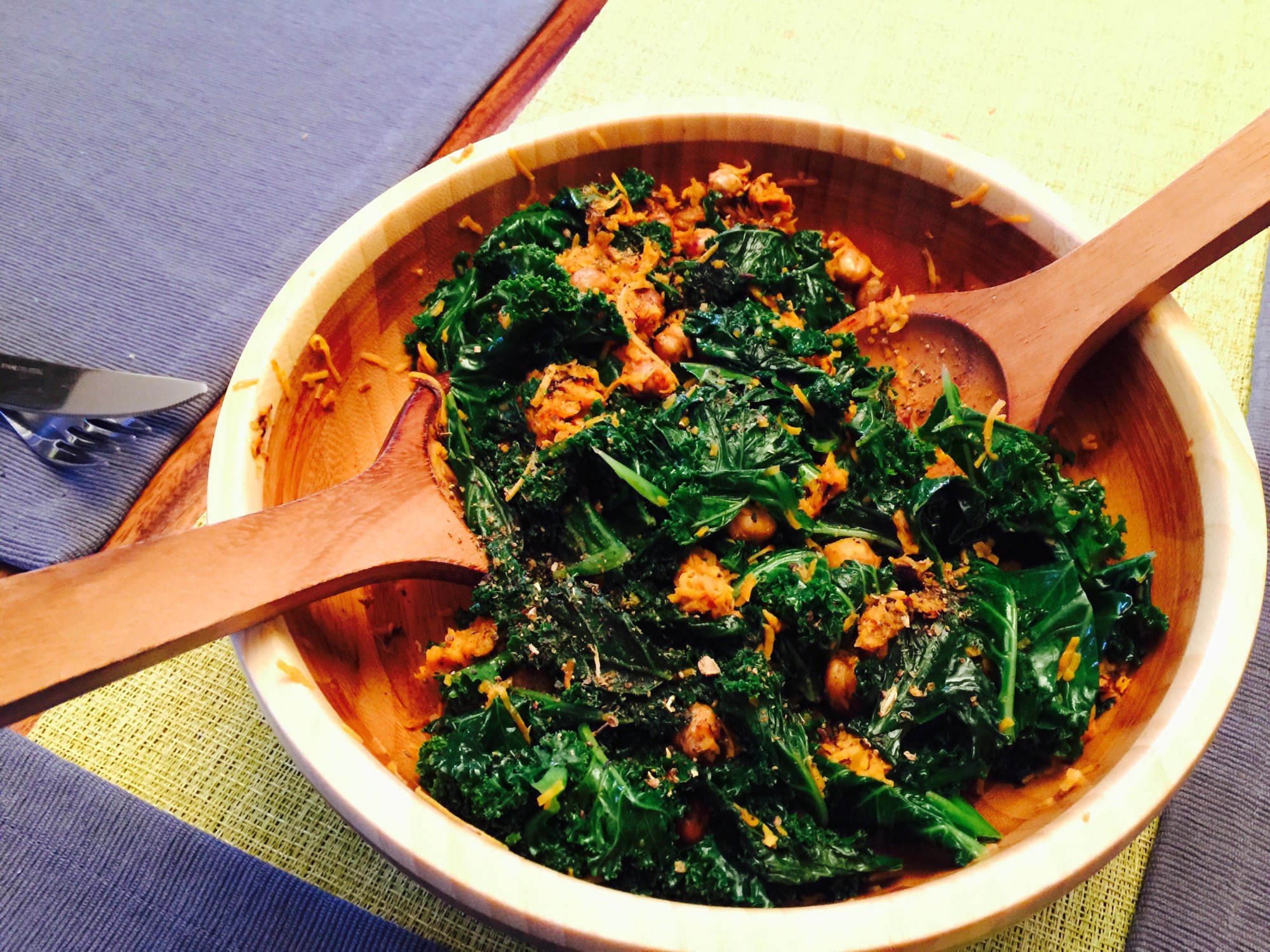 Dans la même poêle que pour les patates douces, faire revenir le kale dans l’huile d’olive, durant environ 3 à 5 minutes. Ajouter sel et poivre.