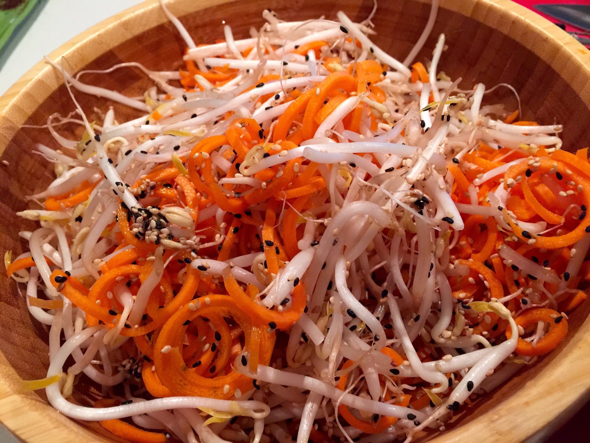Couper les carottes en julienne et ajouter les graines de sésames et les fèves germées ainsi que la vinaigrette. Saler et poivrer.