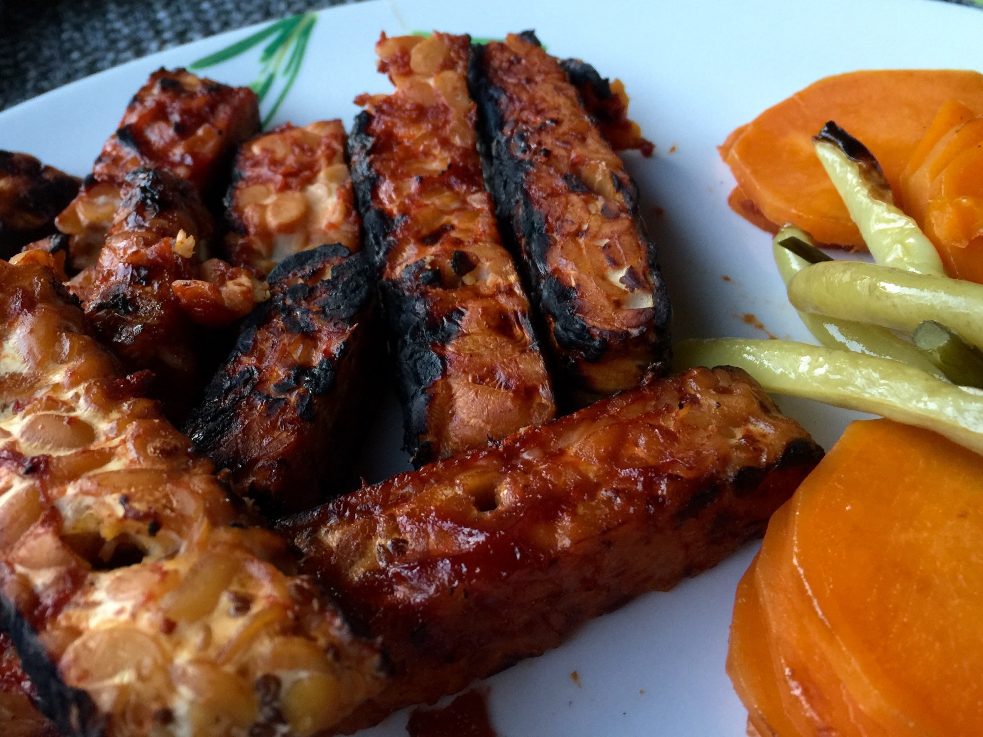 Couper le tempeh en tranches d’1,5 à 2 cm. d’épaisseur. Les disposer dans un plat et les napper de sauce barbecue. Bien mélanger et laisser mariner 1 à 2 heures.