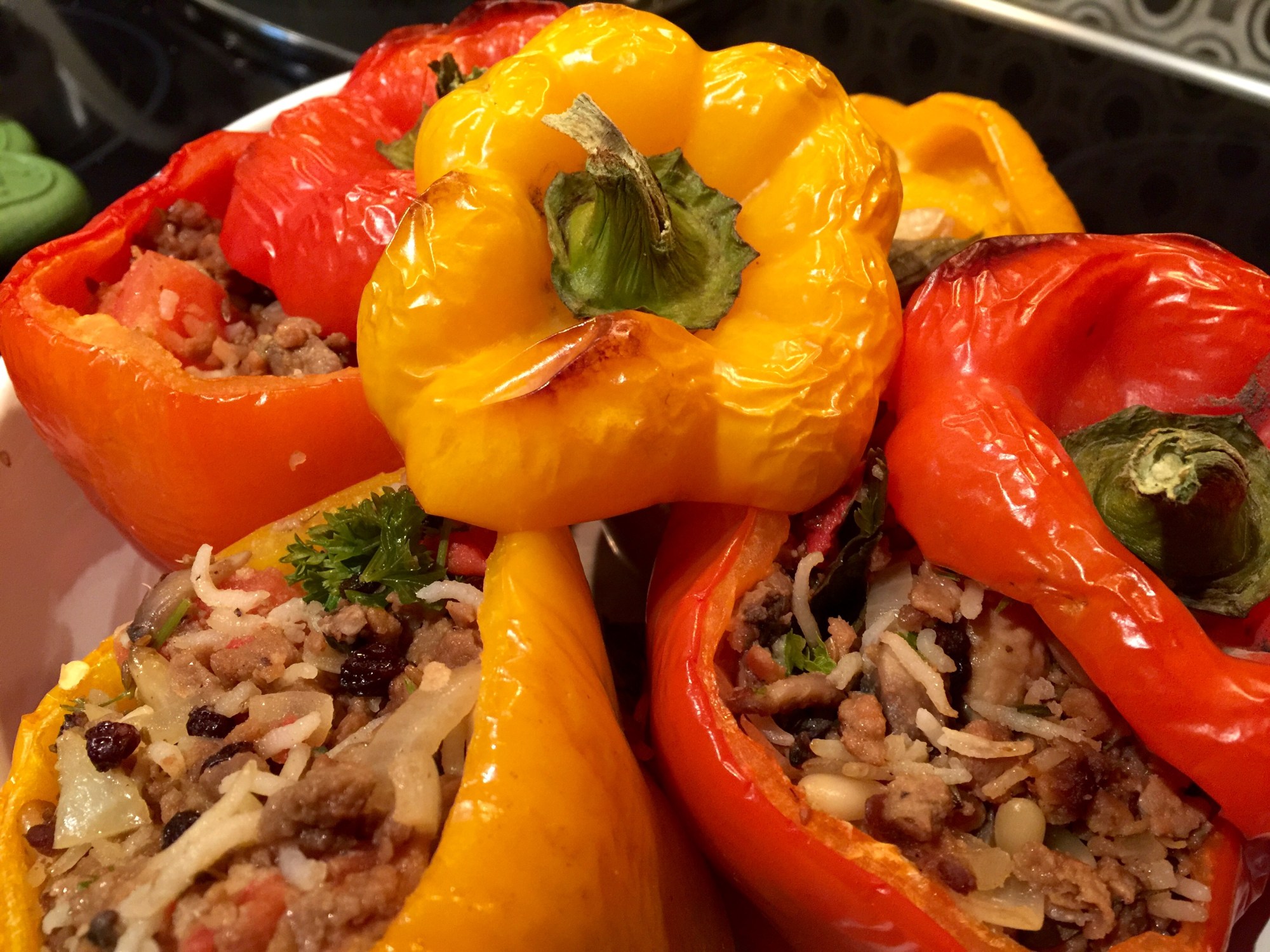 Couper le dessus des poivrons. Enlever le coeur et farcir de la préparation. Replacer le dessus des poivrons et mettre au four 30 minutes.