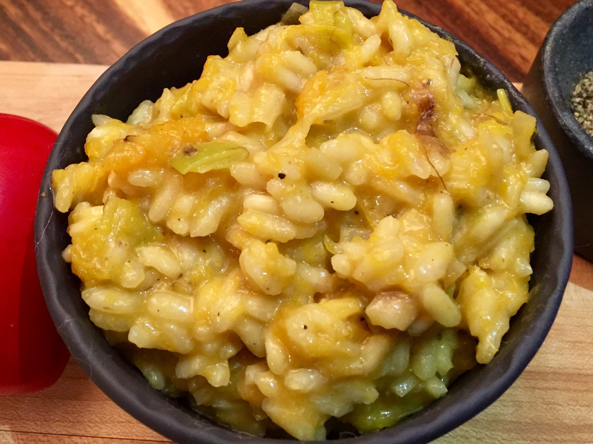 Lorsque le riz est presque cuit, défaire la courge en purée et l’ajouter au riz. Ajouter la levure alimentaire, le sel et le poivre et le romarin. Ajouter le bouillon. La levure va absorber beaucoup de liquide.