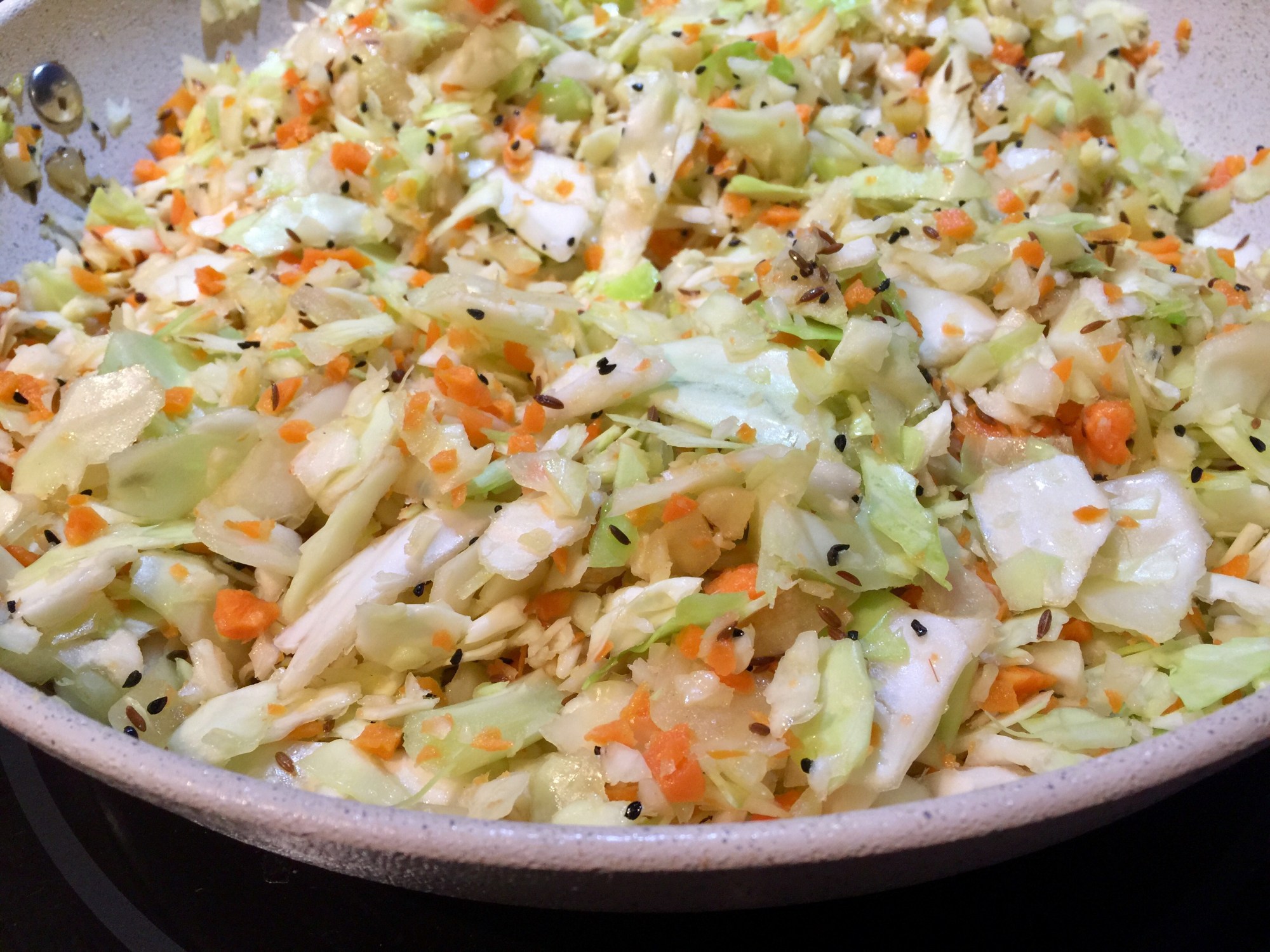 Dans le même wok ou la même poêle, à feu moyen, dorer l’oignon dans l’huile. Ajouter le gingembre et cuire 1 minute. Ajouter les épices grillées, le chou, la carotte et le piment. Saler et poivrer légèrement, selon le type de piment choisi.