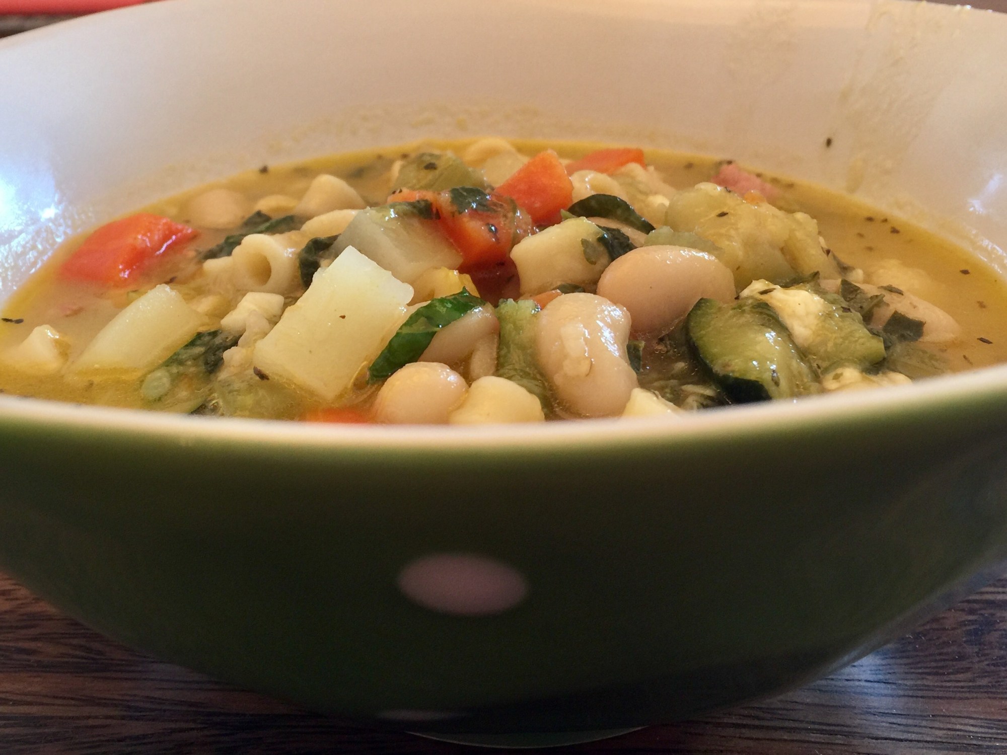 Mélanger le basilic frais, l’ail épluché, le parmesan et l’huile. Ajouter du bouillon.