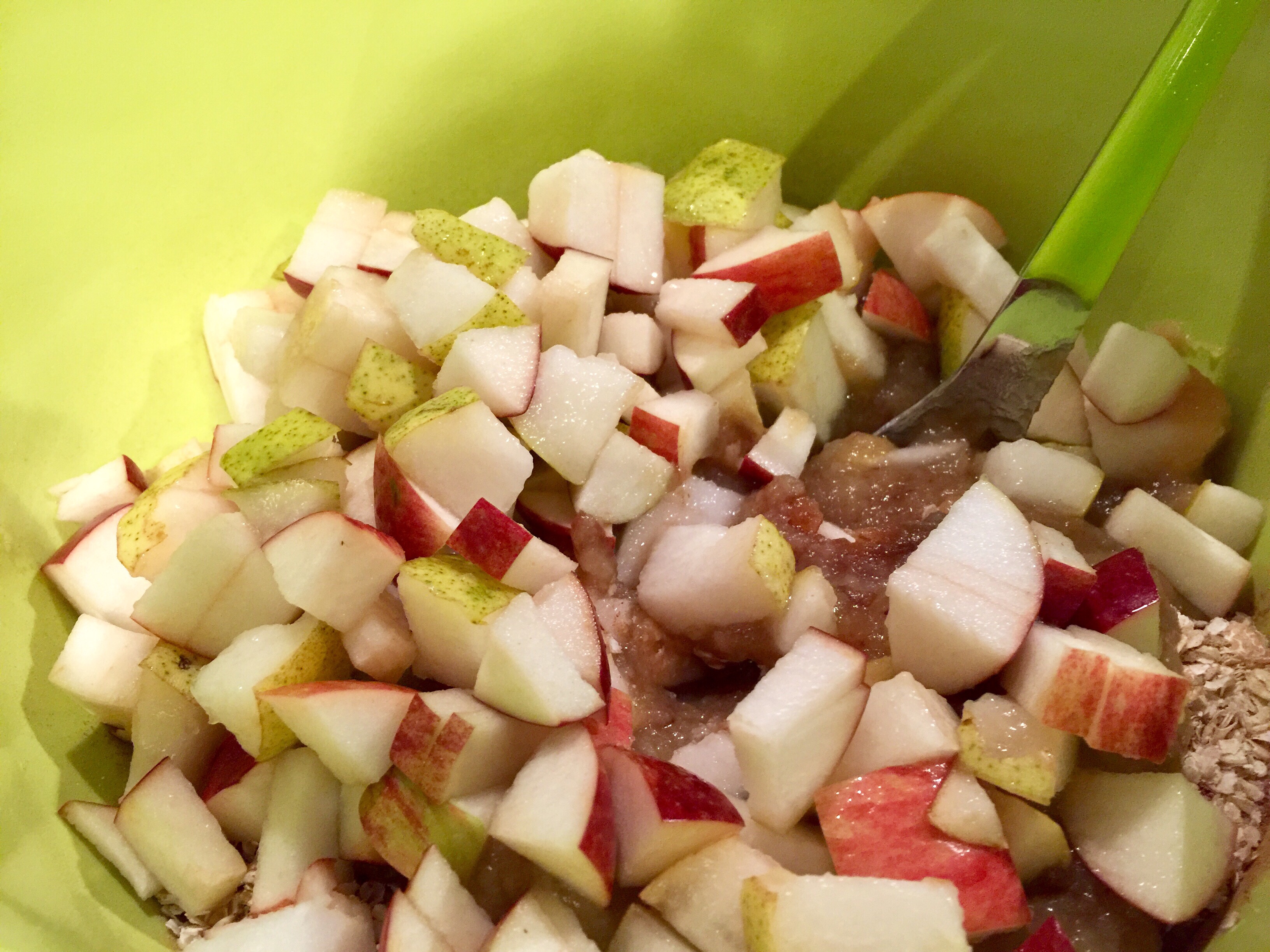 4. Verser le mélange liquide au mélange sec, puis ajouter les pommes et la poire coupées
