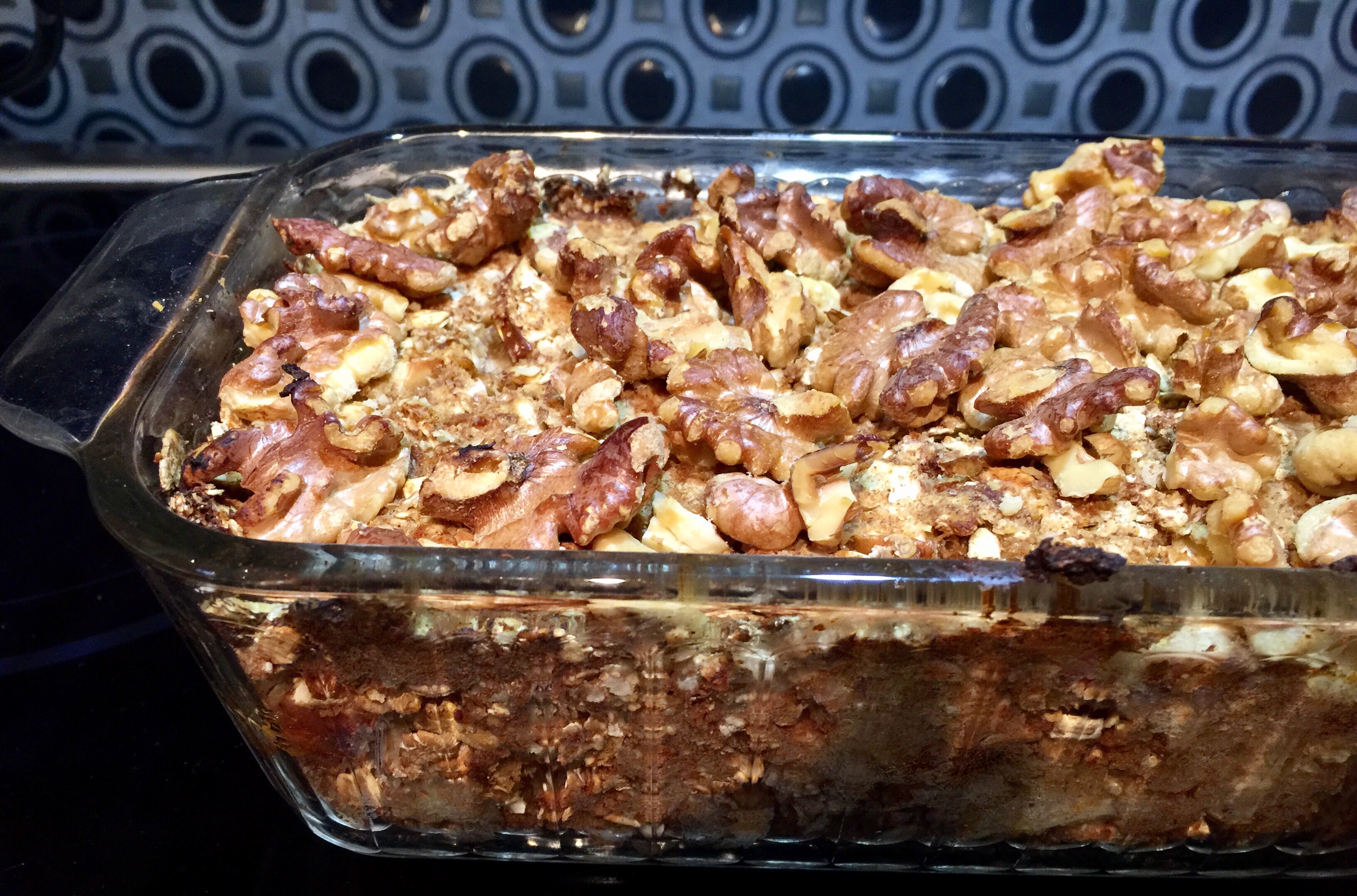 5. Verser le mélange dans le plat allant au four et saupoudrer de noix de Grenoble hachées.