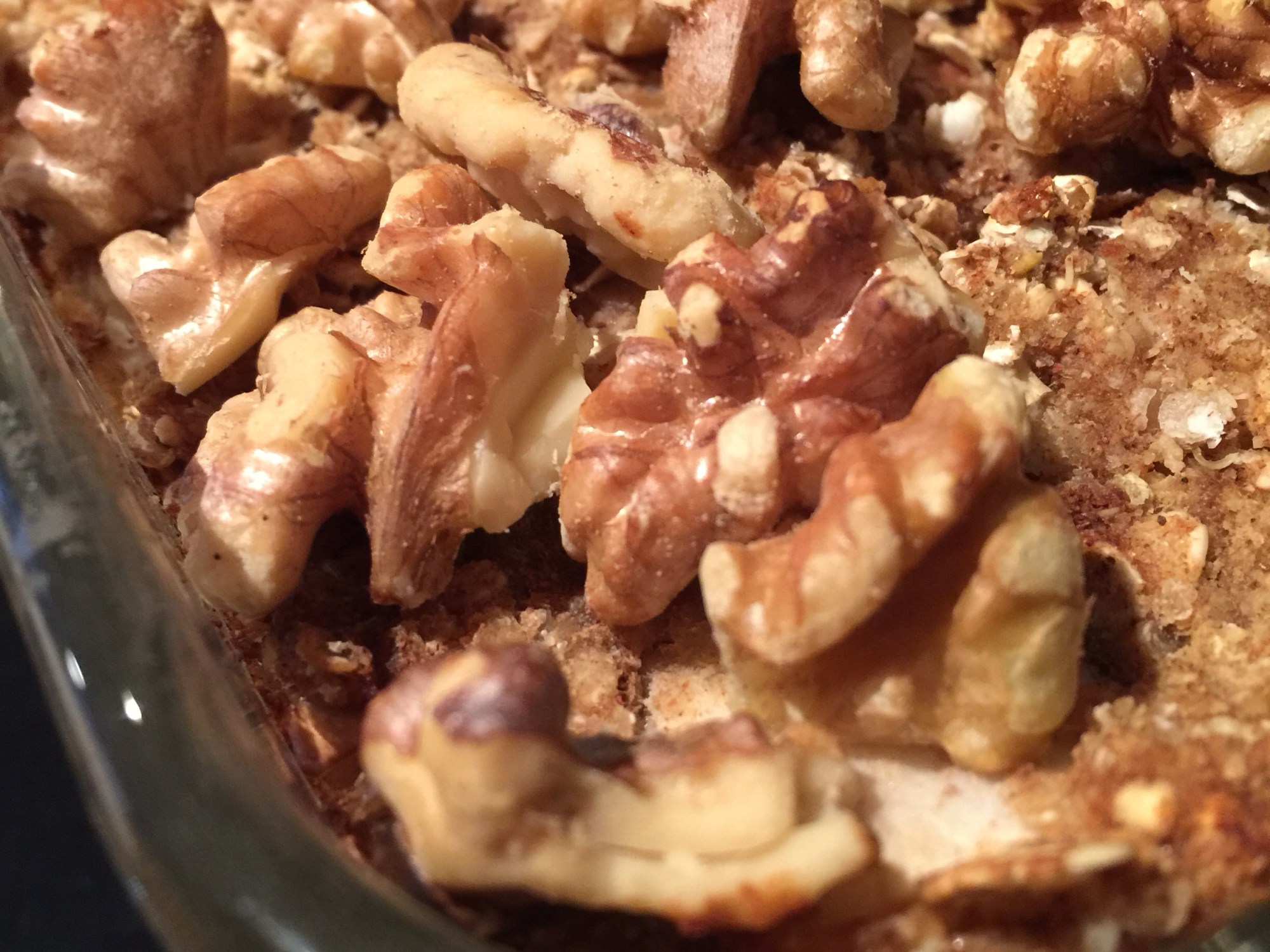 5. Verser le mélange dans le plat allant au four et saupoudrer de noix de Grenoble hachées.