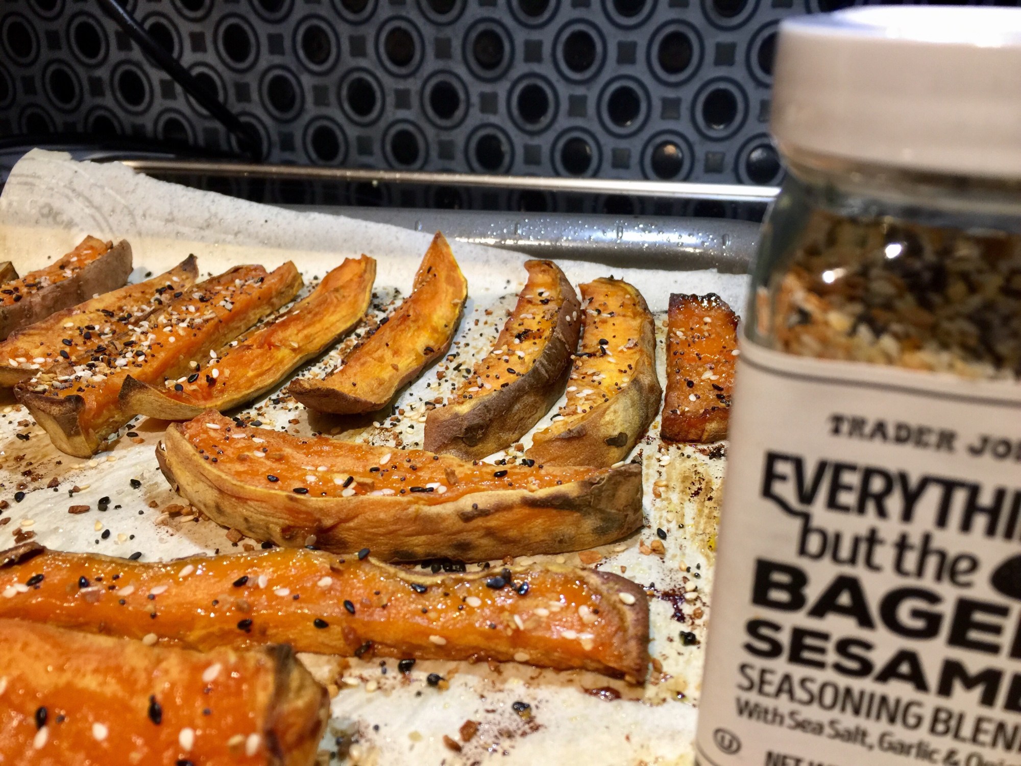 Retournez les frites de patates douces après 20 minutes et saupoudrez-les avec les épices (sel, poivre ou le mélange de Trader Joe ) et ajoutez l’ail émincé (vous pouvez omettre l’ail si vous utilisez le mélange qui en contient déjà).
