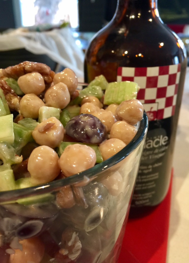 Ajouter les pois chiches, les raisins, les noix de pécan et le céleri à un bol de taille moyenne. Garnir de vinaigrette et mélanger pour enrober.