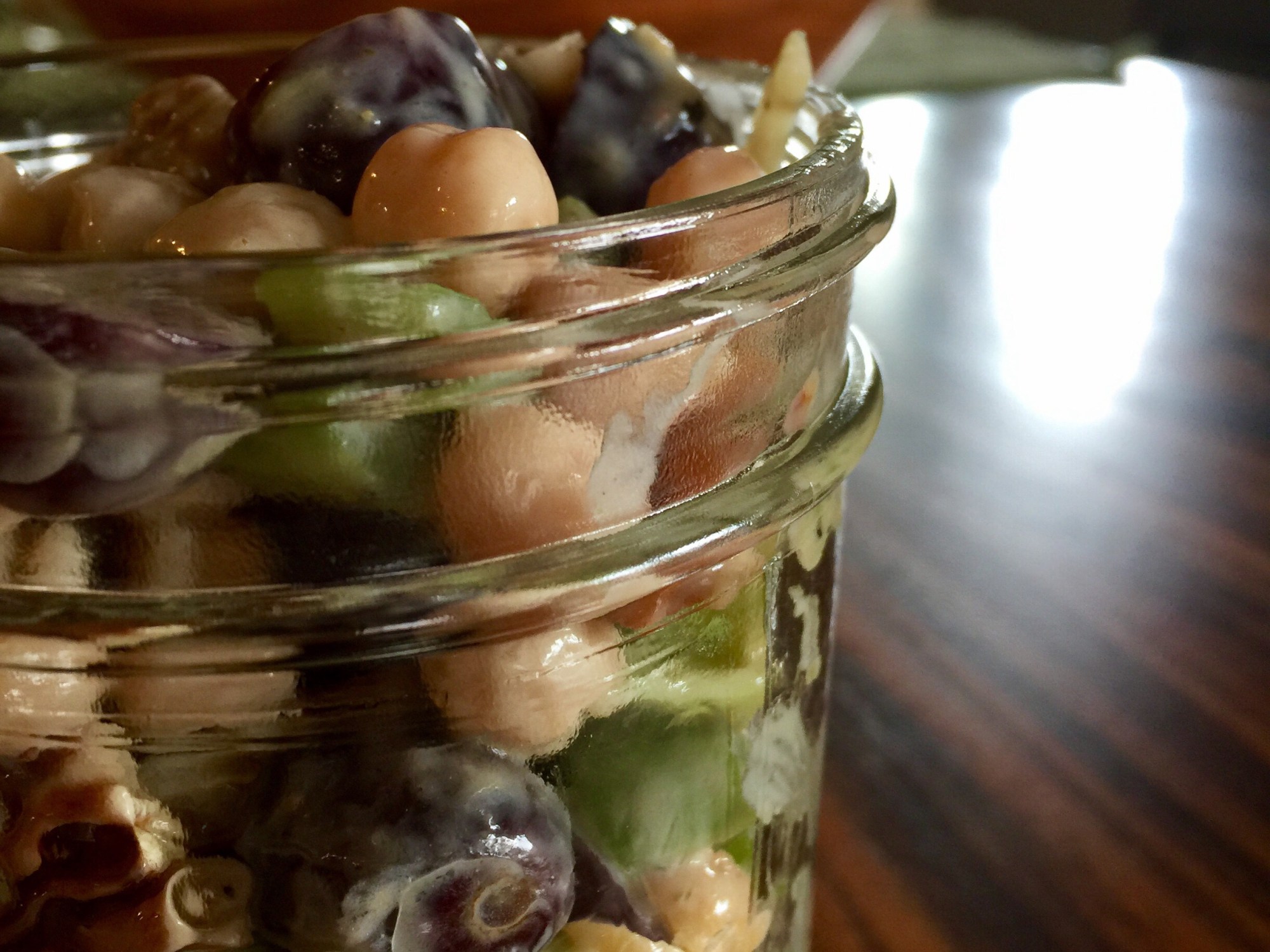Ajouter les pois chiches, les raisins, les noix de pécan et le céleri à un bol de taille moyenne. Garnir de vinaigrette et mélanger pour enrober.