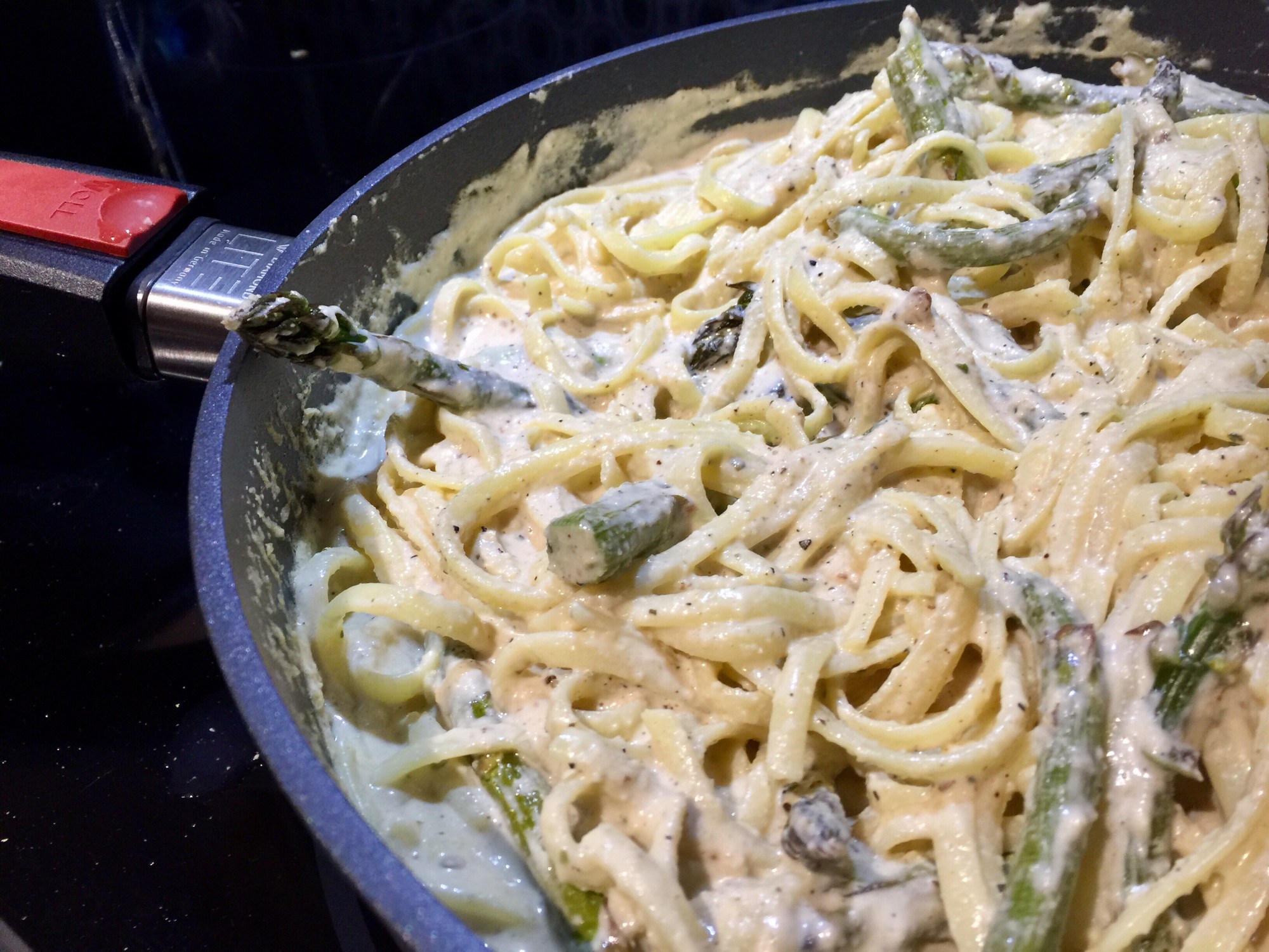 Verser la sauce dans la poêle ayant servi à faire cuire les échalotes françaises et l’ail. Faites chauffer à feu moyen-vif jusqu’à ce qu’elle arrive à ébullition. Lorsque celle-ci est atteinte, diminuer le feu à mijoter, ajouter vos pâtes cuites dans la sauce ainsi que vos asperges rôties et mélanger jusqu’à ce que les pâtes soient bien recouvertes de sauce et les asperges bien dispersées. Servir immédiatement.