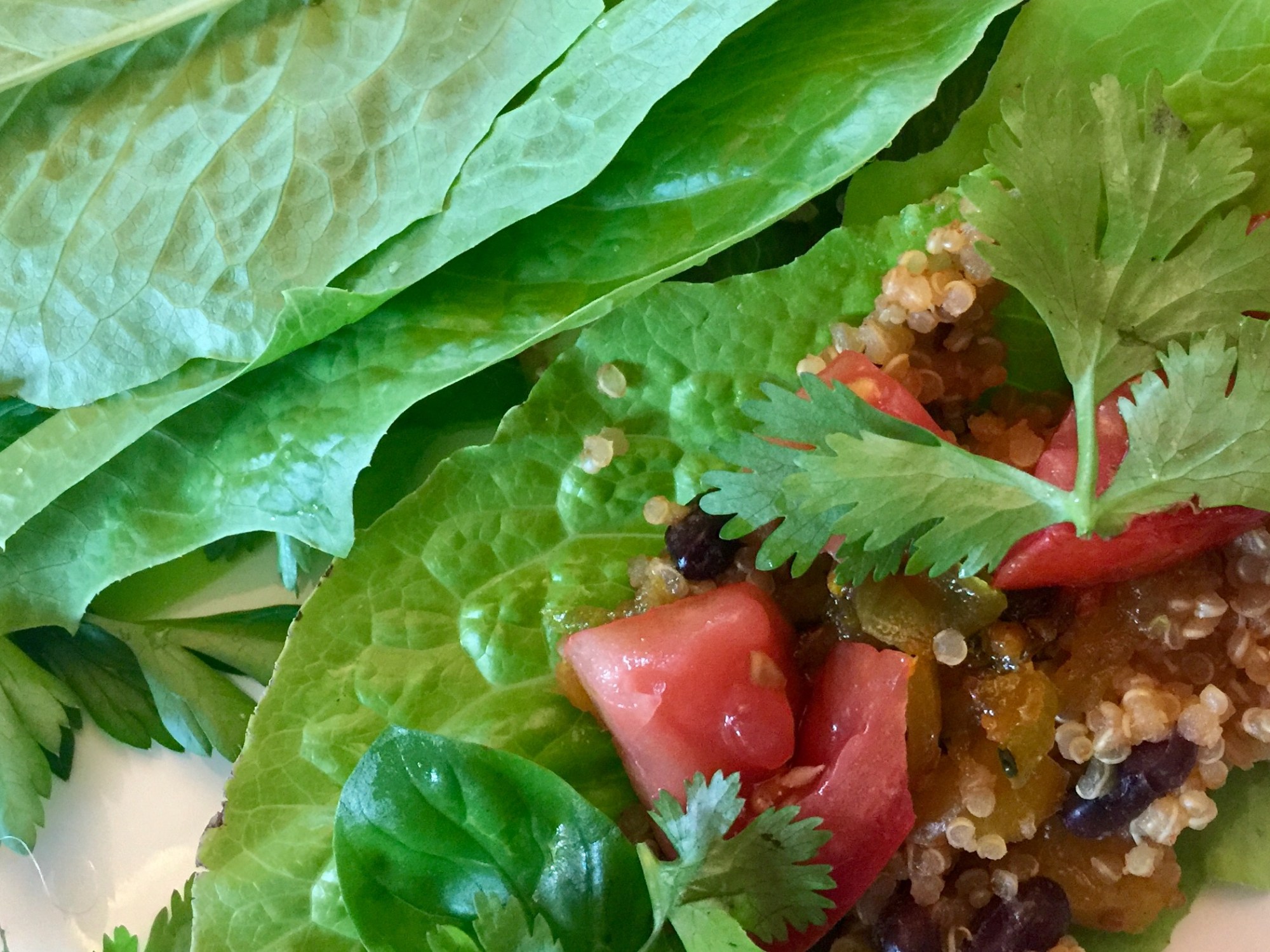 Placer une grande feuille sur une assiette. Ajouter une autre feuille sur le dessus de sorte que sa base pointe vers l’opposé de la feuille ci-dessous. Recouvrir chaque couche de laitue d’une cuillerée de quinoa chaud. Ajoutez vos garnitures désirées, une petite pincée de sel, et un coin de lime sur le côté.