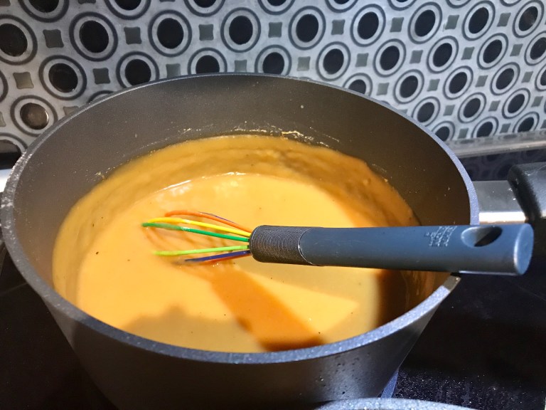 Mélanger tous les ingrédients sauf la farine. Mettre dans une casserole et faire chauffer.