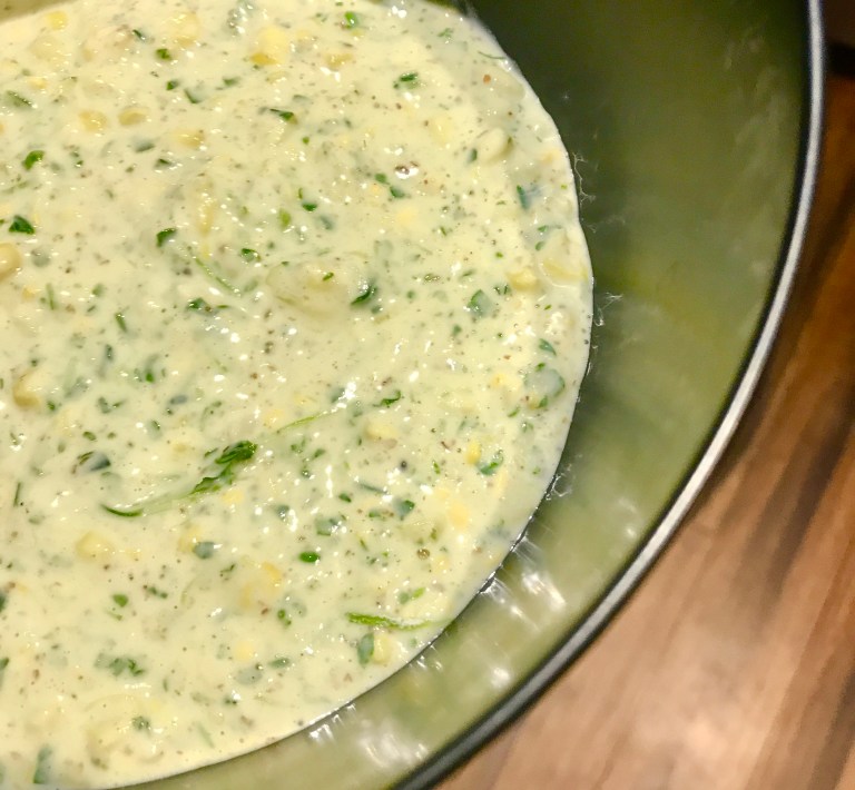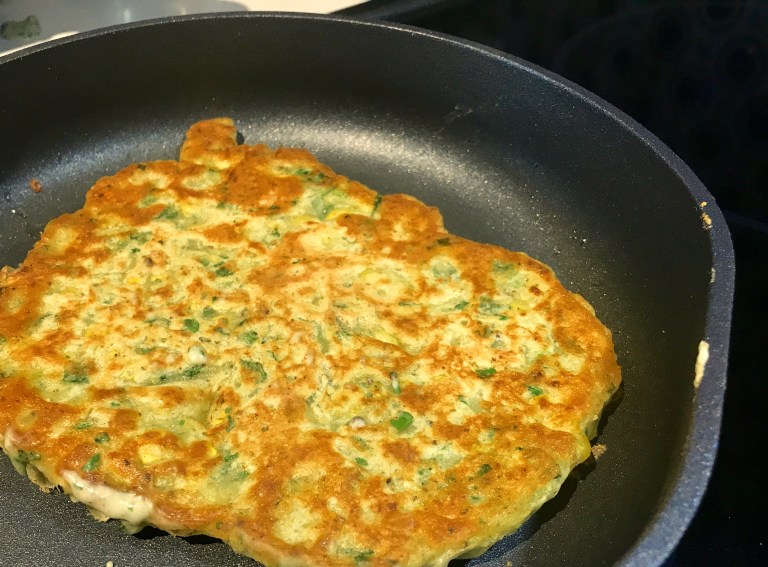 Hacher la coriandre. Dans un grand bol, mélanger la farine, la poudre à pâte et le sel. Faire un puits au centre, ajouter le lait de soja et l’œuf vegan. Fouetter jusqu’à consistance lisse.