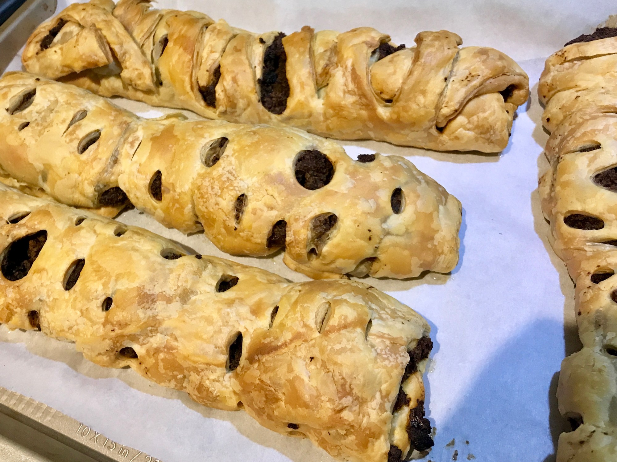 Préchauffer le four à 350 ° F. Déposer à la cuillère un quart du mélange de champignons sur la longueur de chaque rectangle de pâte et façonner le mélange en une bûche. Sceller la pâte en enroulant les extrémités autour du mélange et en pinçant les extrémités ensemble. Ensuite, retourner les roulés de saucisses de façon à ce que la pâte se rejoigne se trouve en bas.