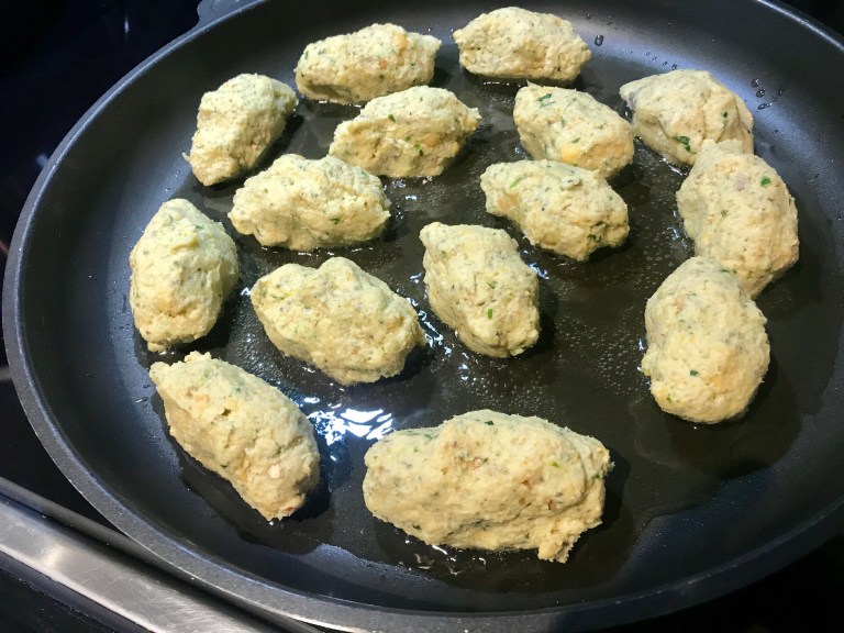 Chauffer une grande poêle à frire et couvrir la surface avec de l’huile. Lorsque l’huile est chaude, faites cuire les falafels. Pour les former, utiliser deux cuillères à soupe pour former des boules puis aplatir légèrement avec une fourchette.
