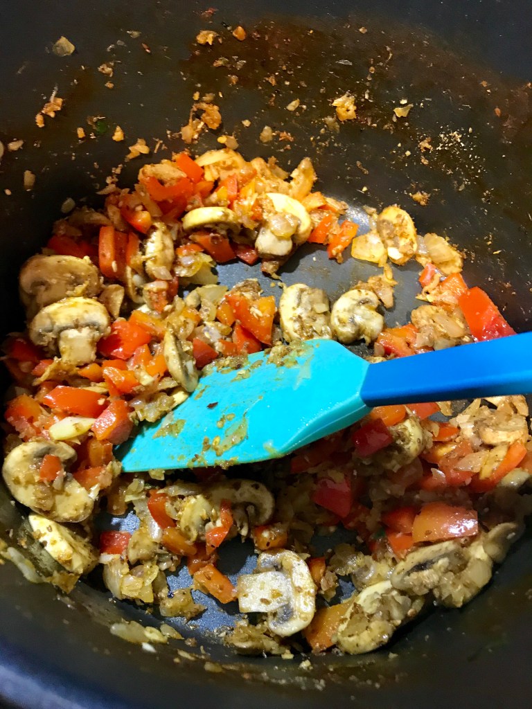 Ajouter le piment, les poivrons rouges et les champignins et bien mélanger pour que les poivrons commencent à ramollir.