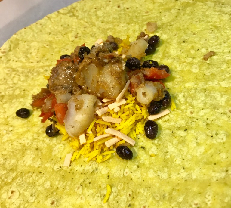 Mettre environ 1/3 tasse de riz basmati cuit au centre d’une tortilla.
