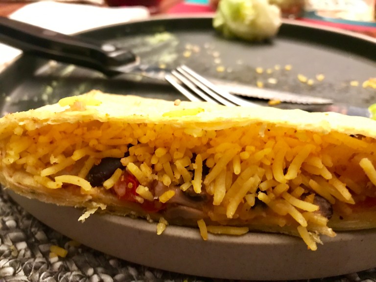 Découper un triangle dans l’une des tortillas et placer le triangle au-dessus du riz, du fromage et de la pomme de terre au milieu de la tortilla. .