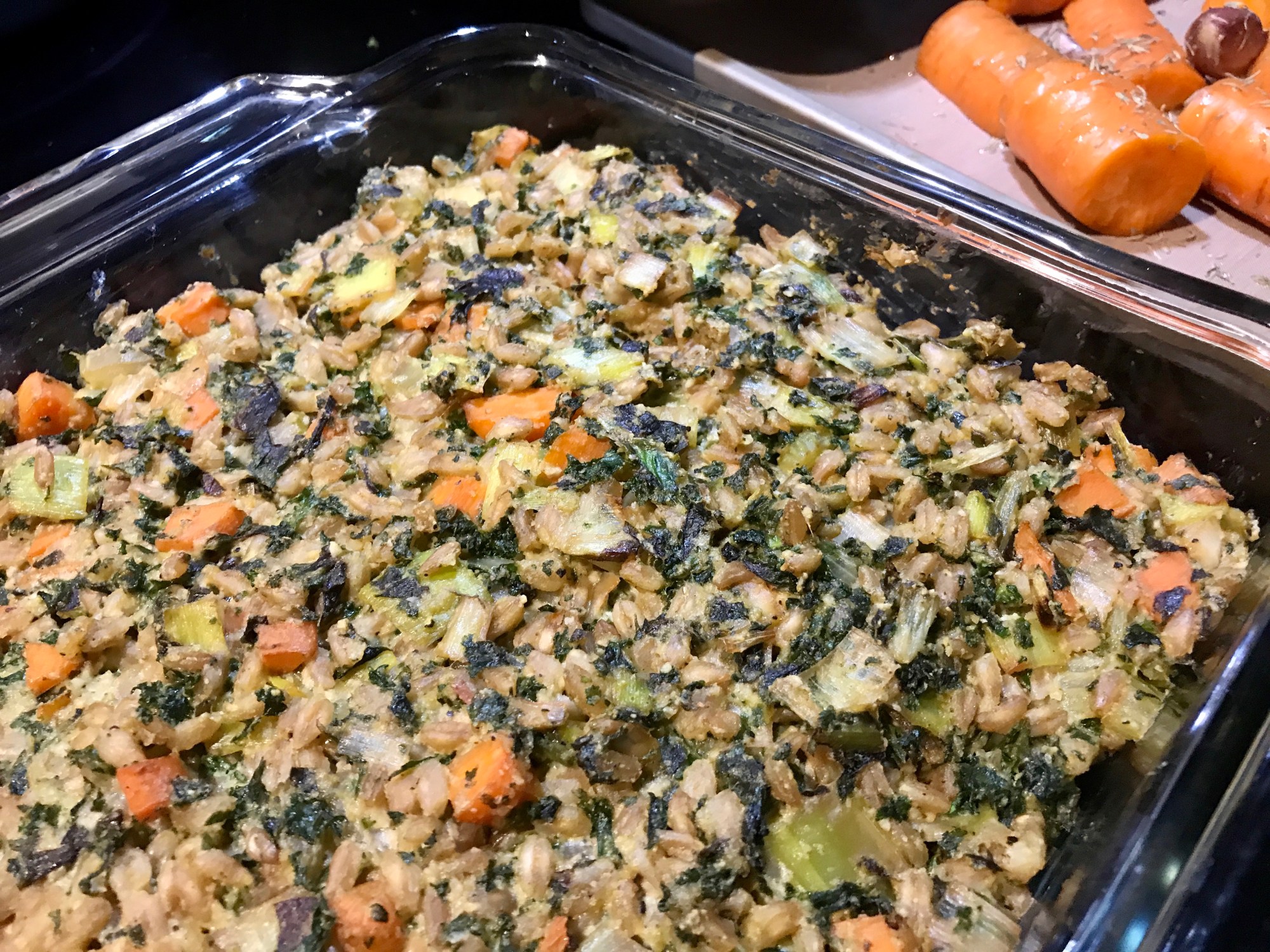 Dans une grande poêle, cuire les champignons, les poireaux émincés, le céleri haché, les carottes et l’ail, pendant 5 à 6 minutes ou jusqu’à tendreté, en remuant de temps en temps et en ajoutant de l’eau, 1 à 2 c. à la fois, au besoin pour éviter de coller. Incorporer le kale. Cuire 2 à 3 minutes ou jusqu’à ce que le kale soit fané. Incorporer le farro cuit et la purée de cajou. Verser dans un récipient de 2 pintes.