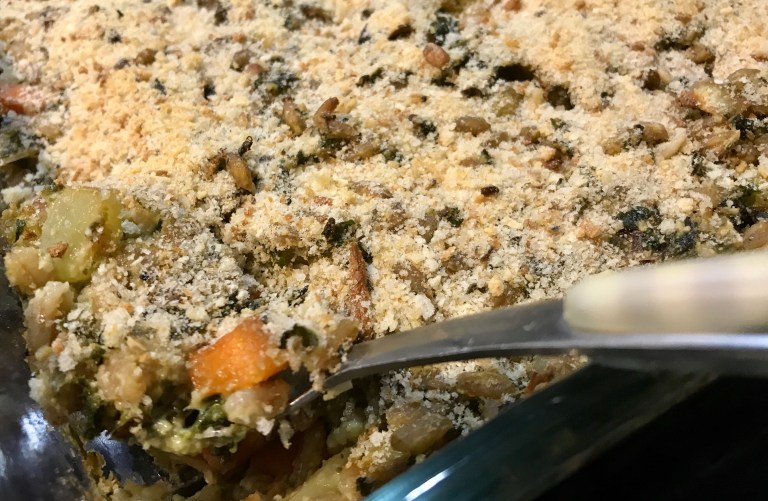 Cuire au four à couvert, 15 minutes. Saupoudrer de chapelure. Remettre au four, à découvert, 10 à 15 minutes de plus.
