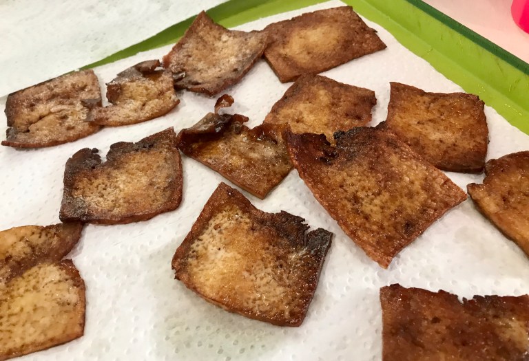 Dans un grand poêlon chaud, mettre un peu d’huile d’olive et faire cuire les morceaux de tofu. Faire en plusieurs fois pour éviter qu’ils ne se chevauchent. Les retourner quelque fois pour éviter qu’ils ne brûlent et les retirer quand ils sont bien colorés. Mettre sur un papier essuie-tout pour absorber l’huile.