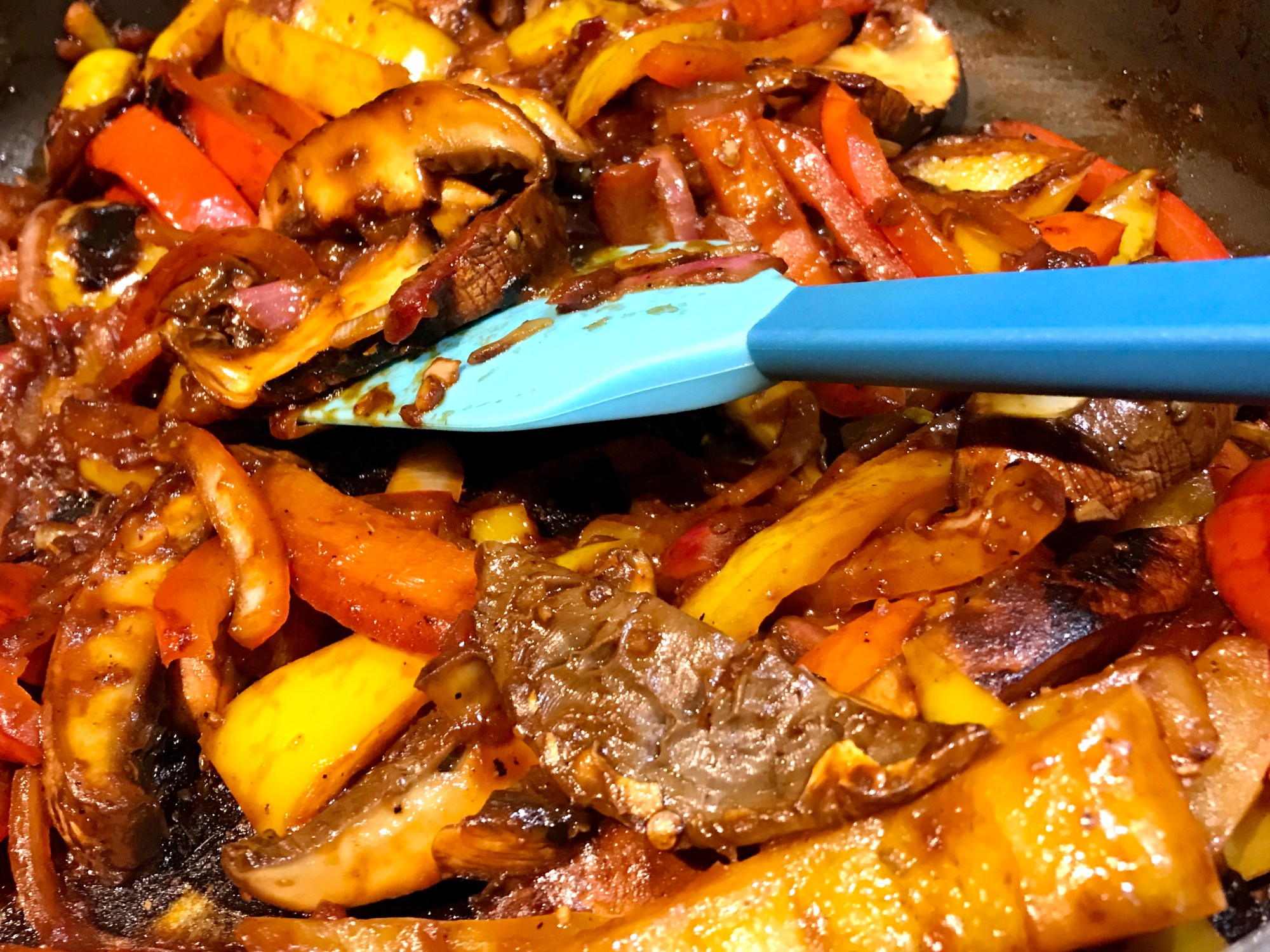 Mettre les champignons et les poivrons sur une planche à découper et trancher en lanières. Remettre les légumes dans la poêle et ajouter la sauce. Cuire environ 5 minutes.