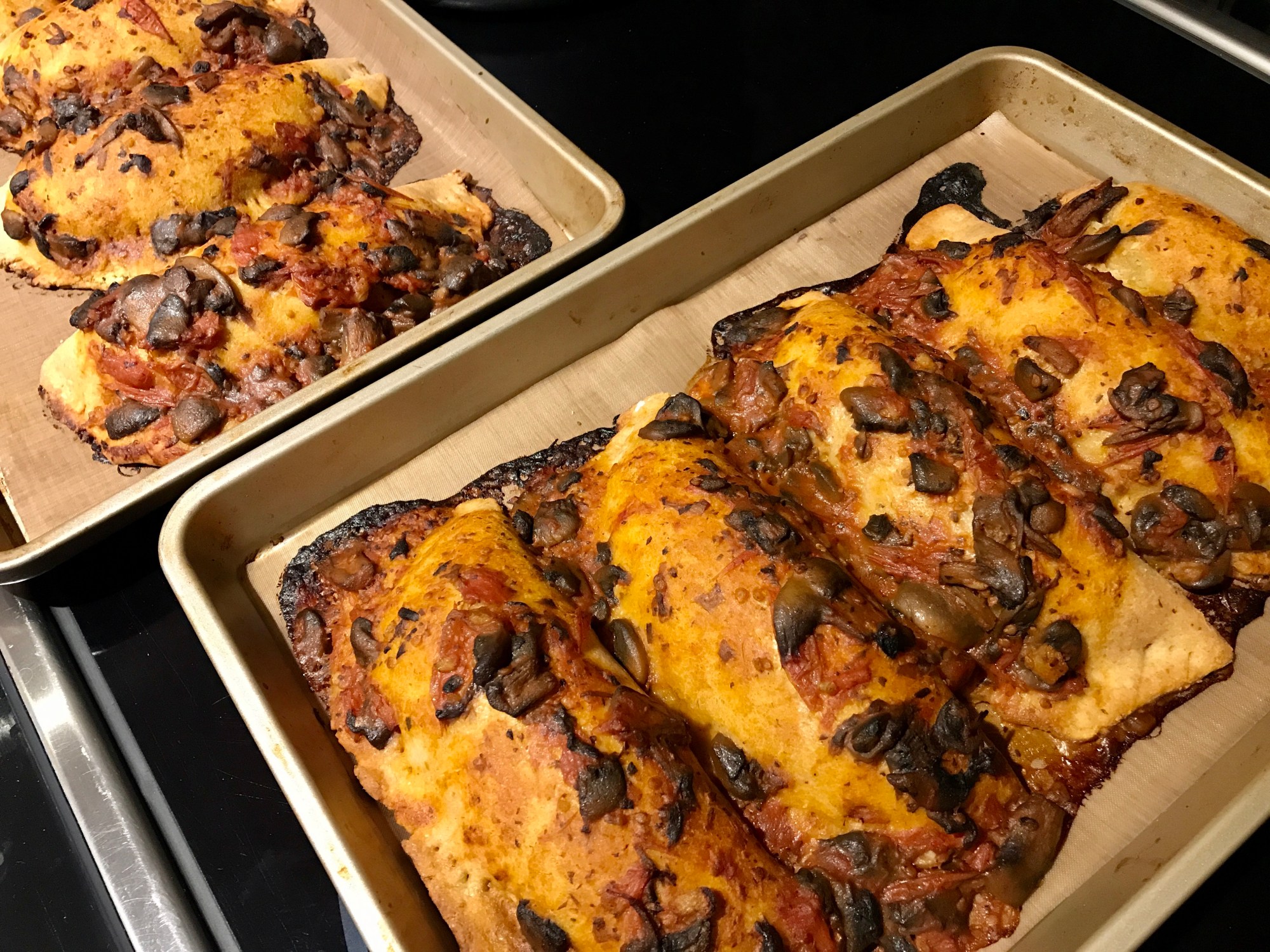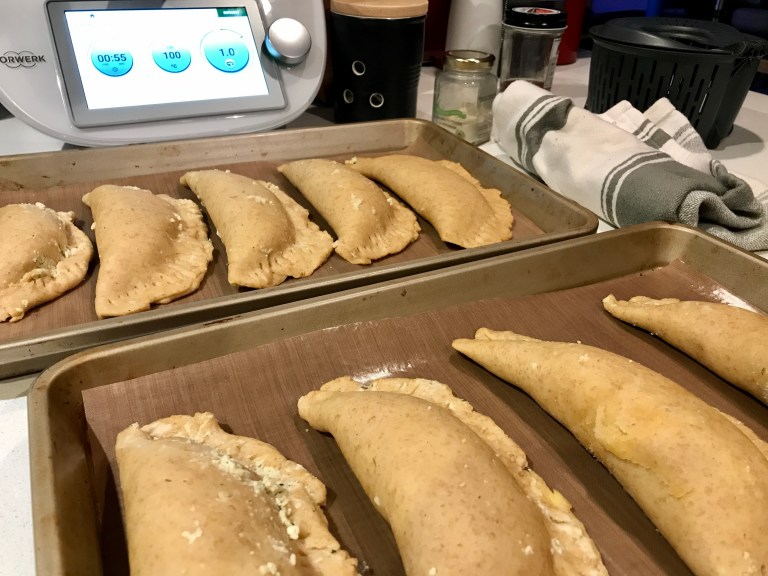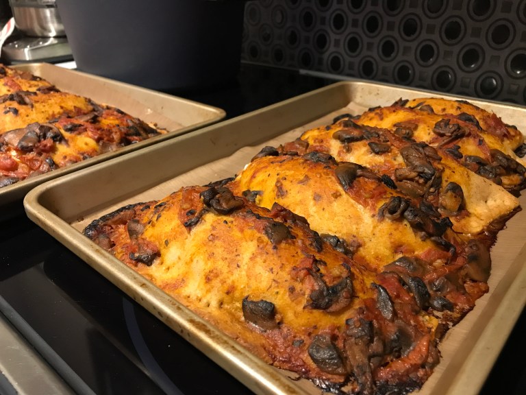 Garnir de farce à la ricotta, ajouter quelques tranches de poivrons grillés ou de légumes grillés et replier chaque carré en deux, en formant un rectangle fermé. Sceller les bords en appuyant bien, en utilisant une fourchette. Disposer les calzones sur la plaque préparée et garnir la surface de sauce aux champignons.