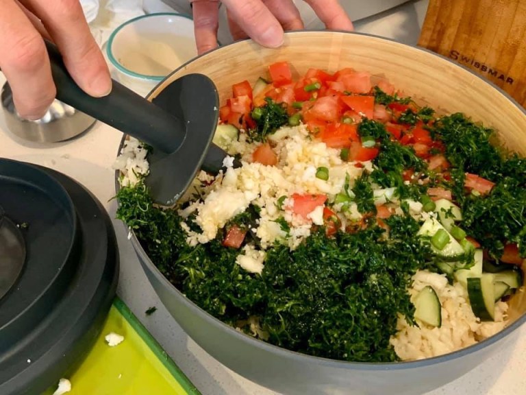 Mettre les herbes dans le bol et hacher 10 secondes/vitesse 7. Ajouter les herbes au chou-fleur. Ajouter ensuite les dés de tomate, les concombres, le quinoa, le jus de citron et l’huile d’olive. Assaisonner de sel et poivre et bien mélanger. Réserver.