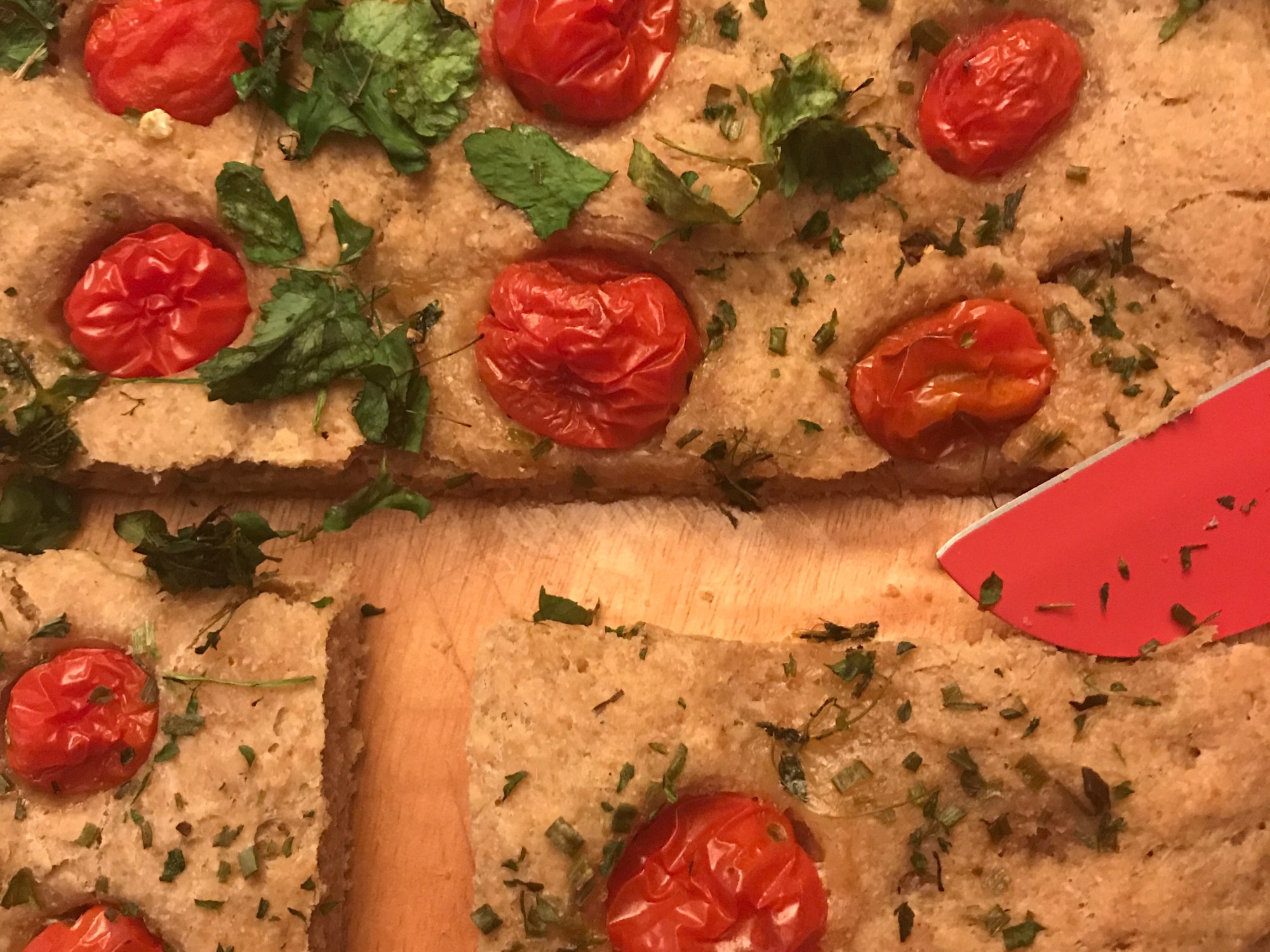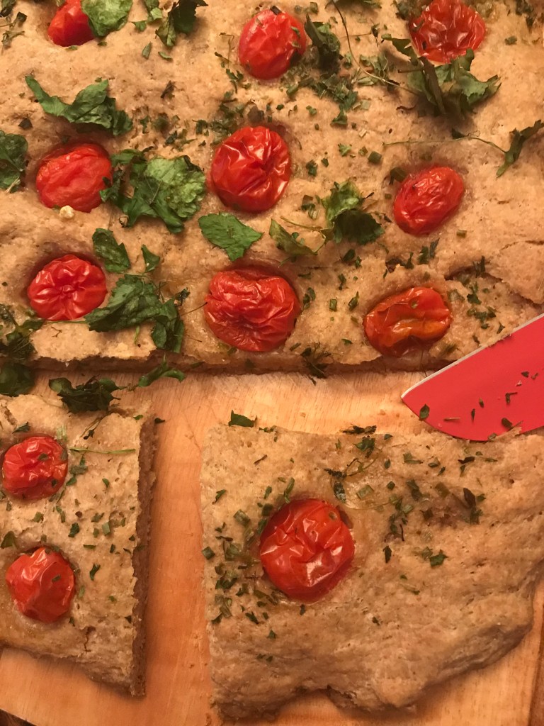 Sortir la pâte du bol et pétrir à la main quelques secondes. Étaler sur une plaque de cuisson généreusement huilé avec les 10 g restants. Faire des trous sur toute la surface avec les doigts et y placer les tomates cerise. Verser le mélange à l’ail. Appliquer avec un pinceau.