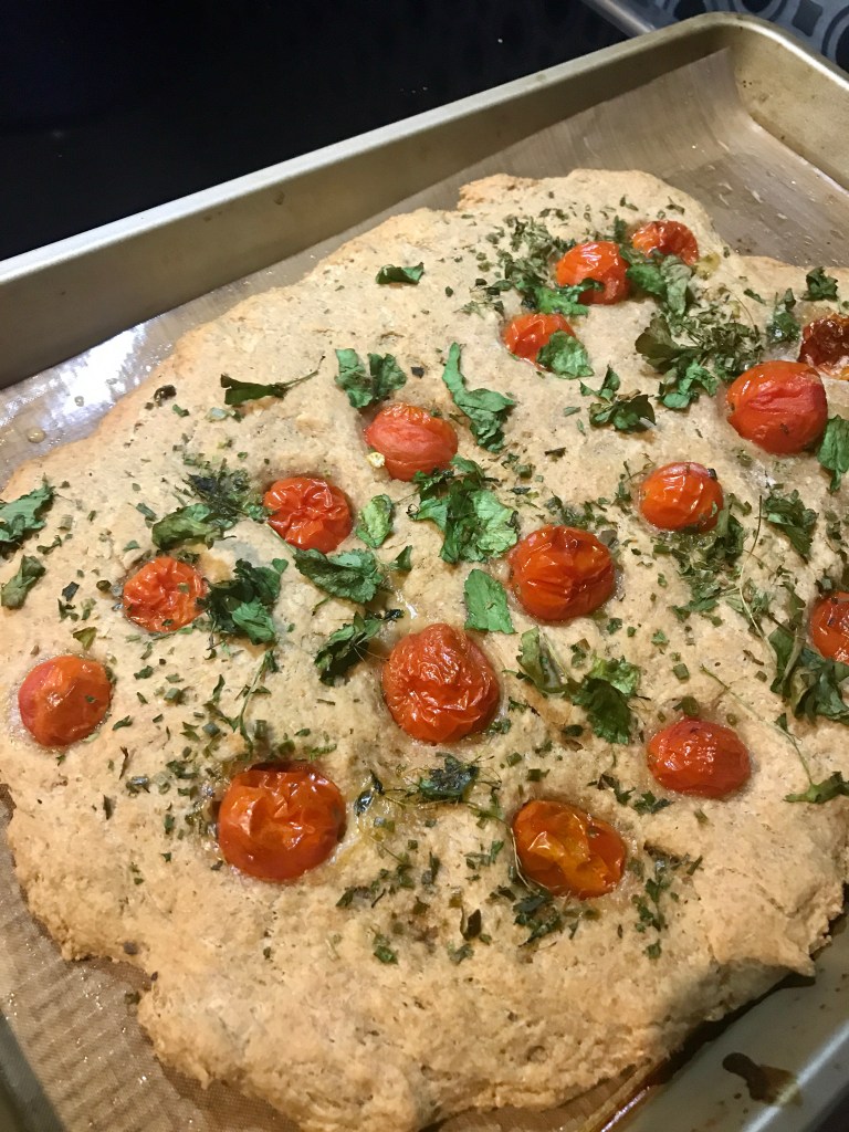 Préchauffer le four à 400°F, 10 minutes avant la fin du temps de pousse. Parsemer du mélange d’herbes fraîches et mettre au four pour 25 minutes. Servir chaud.