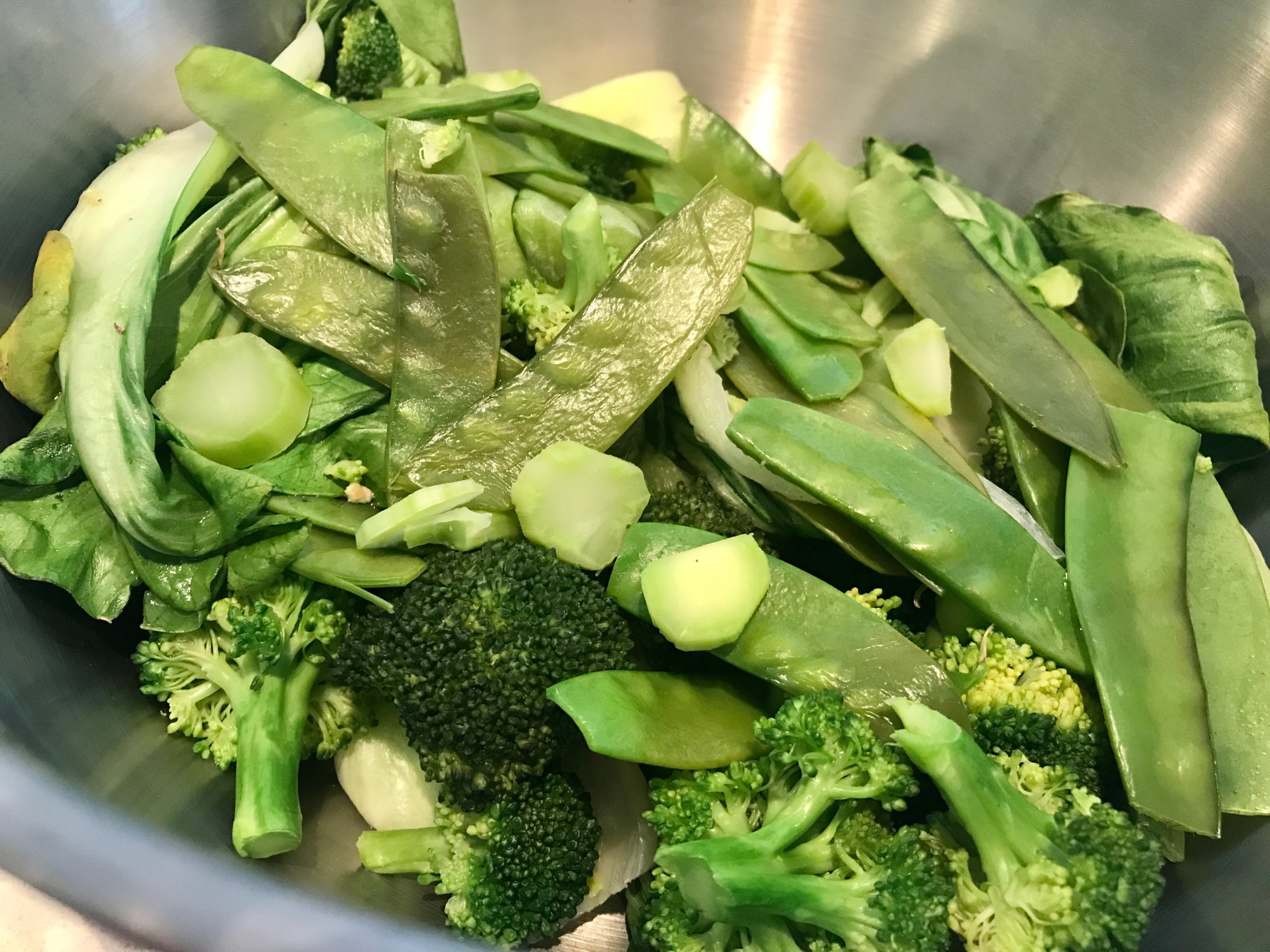 Placer l’eau bouillante dans le bol à mélanger. Placer le plat Varoma en position et peser le brocoli, le bok choy et les pois mange-tout dans le plat Varoma et sur le plateau. Cuire à la vapeur 5 min / Varoma / vitesse 2.