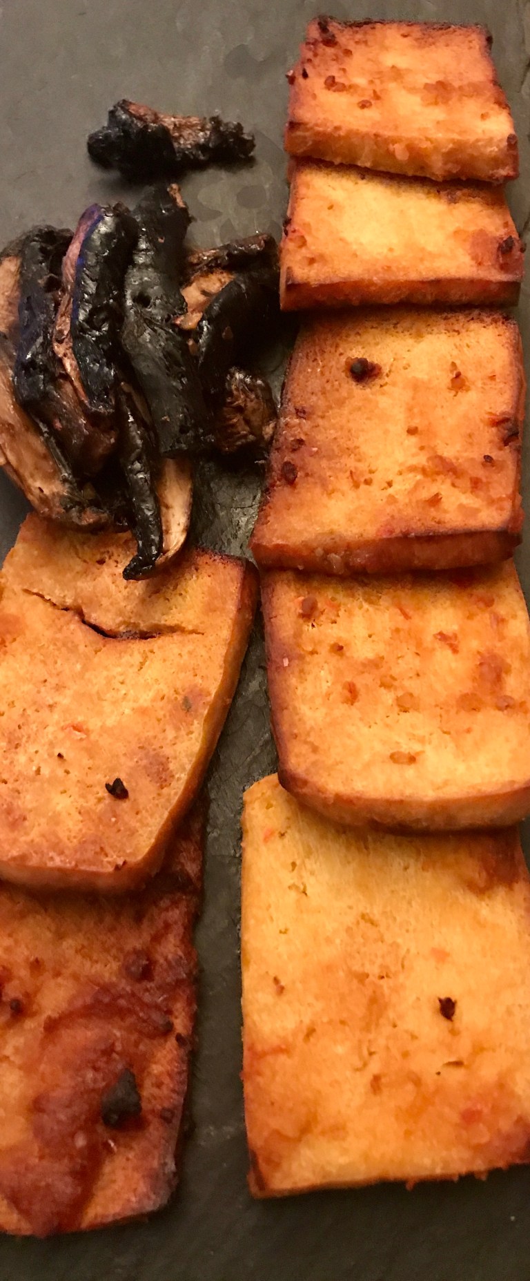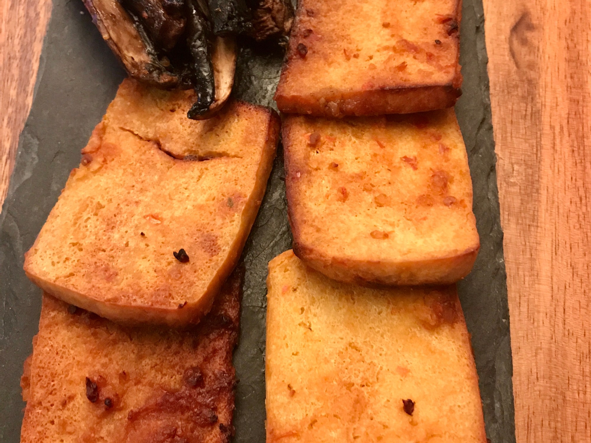 Préchauffer le four à 375F. Déposer les tranches de tofu marinées sur une plaque de cuisson. Curie 20 minutes.