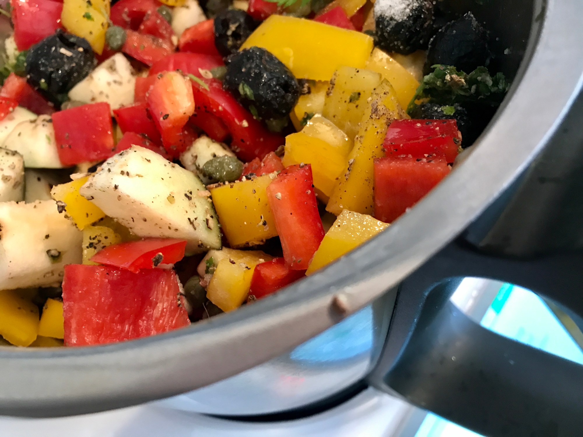 Ajouter l’aubergine réservée, le poivron rouge, le persil haché et le basilic réservés, les olives, les câpres, le sel et le poivre et placer le panier sur le couvercle au lieu du bouchon et cuire 10 minutes / 250 °F/ inversé/vitesse fouet. Garnir de noix de pin et de basilic. Servir chaud, froid ou à température ambiante.