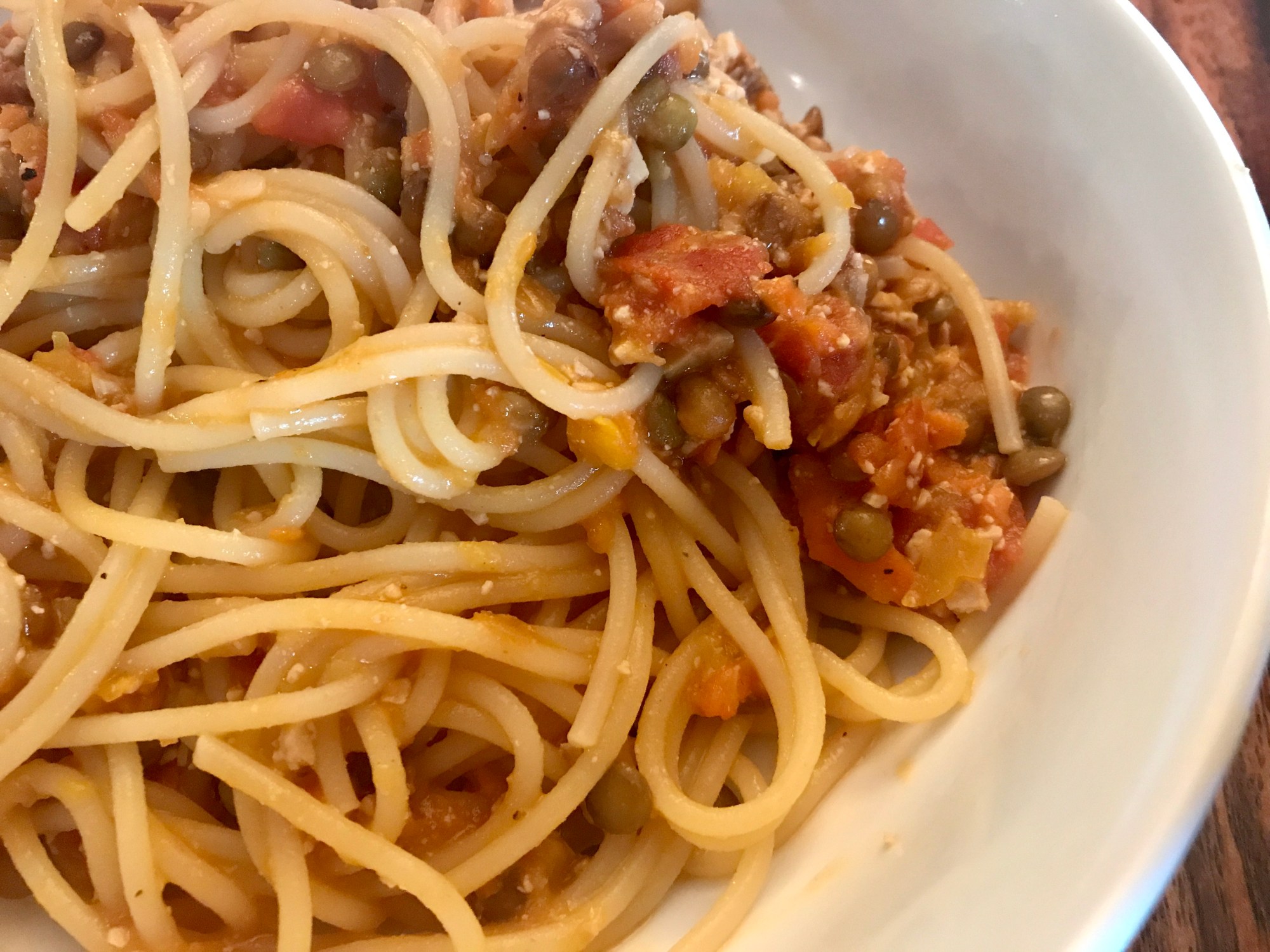 À la sonnerie, égoutter les pâtes dans le panier et les servir avec la sauce. Accompagner de parmesan végétal.