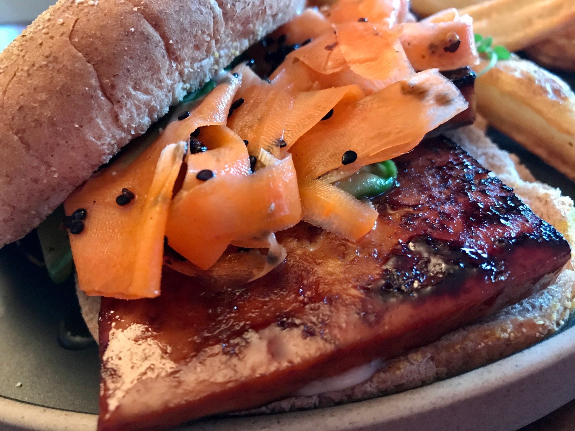 Faire griller le pain. Ajouter la mayo épicée, le tofu, les légumes marinés.