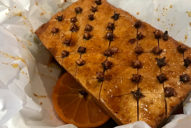 Préchauffer le four à 375 ° F. Tapisser un plat de cuisson de 9 x 13 pouces de papier parchemin. Disposez les tranches d’orange en une couche uniforme au centre du parchemin. Placer le bloc de tofu mariné sur les oranges.
