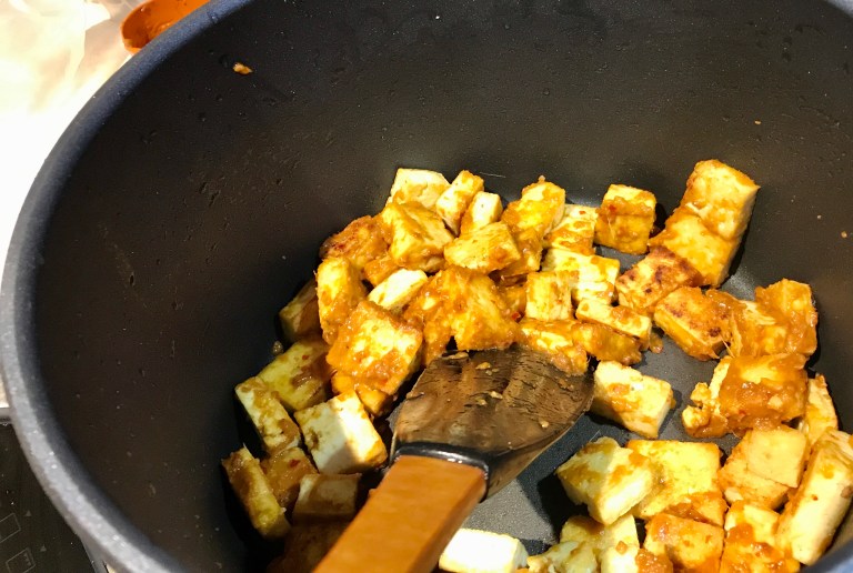 Dans une grande casserole, chauffer l’huile à feu moyen-élevé et faire frire le tofu. Une fois le tofu doré, ajouter 1/4 tasse de pâte de miso épicée et laisser cuire une minute ou deux pour obtenir une belle couleur dorée. Retirer du feu et réserver.
