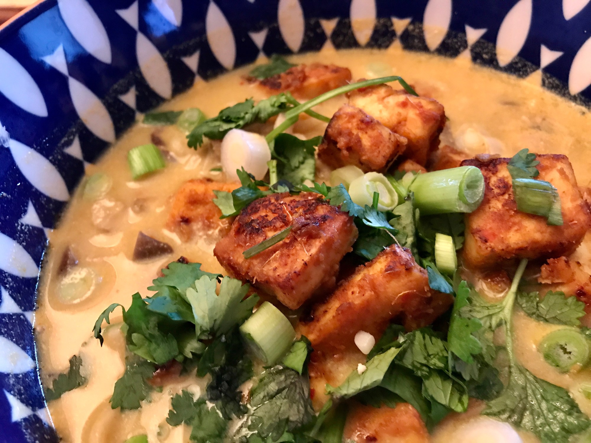 Diviser les nouilles dans quatre grands bols et verser la soupe sur le dessus (vous pouvez en avoir un peu plus que nécessaire). Pour chaque portion, garnir avec le tofu, les oignons verts et l’huile de sésame.