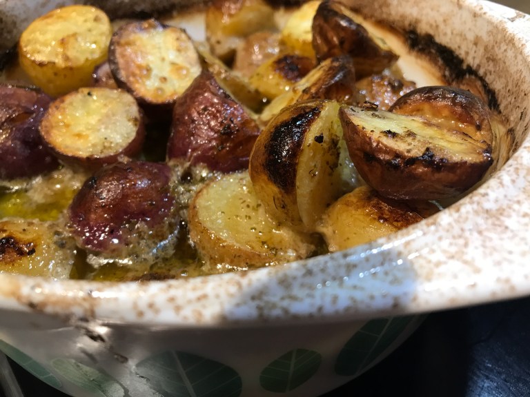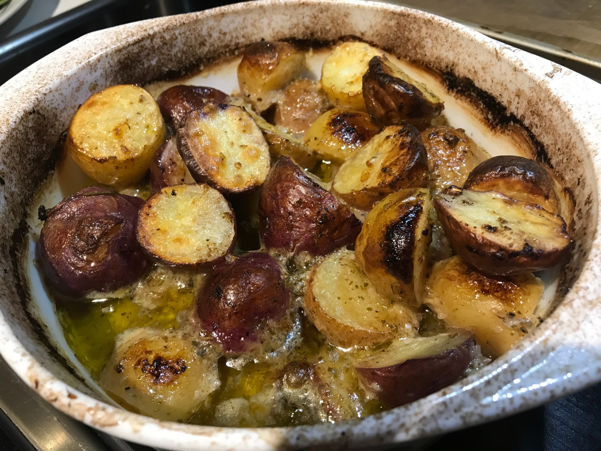 Mettre les pommes de terre et le liquide dans un plat allant au four (environ 25 cm X 20 cm X 5 cm). Recouvrir d’un papier d’aluminium. Cuire 40 minutes. Enlever le papier d’aluminium et brasser. Remettre au four 30 minutes, jusqu’à ce que le liquide soit presque complètement évaporé et que les pommes de terre soient dorées.