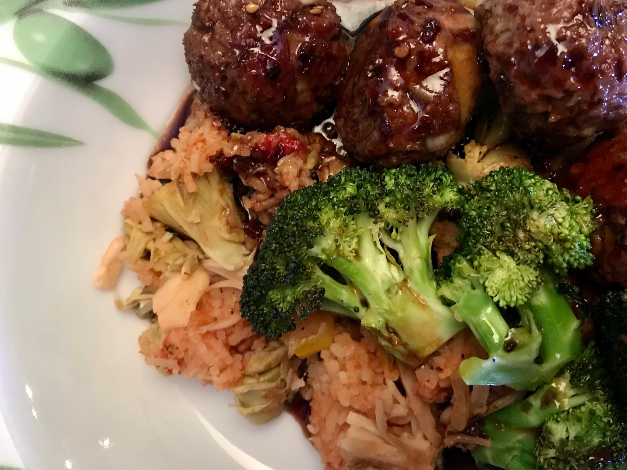 Servir les boulettes et la sauce restante sur des bols de riz garnis d’oignons verts supplémentaires et de graines de sésame. Servir avec les brocolis.
