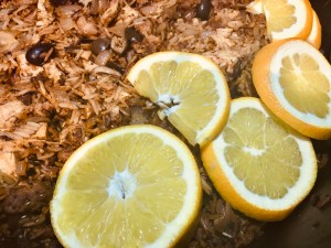Ajouter le riz et mélanger pour bien l’enrober. Ajouter le bouillon de légumes, le vin blanc, les olives noires, la pâte de tomates, le basilic, le romarin, le thym et le paprika et porter à ébullition. Remettre le poulet végétal réservé dans la cocotte et le couvrir de tranches d’orange. Couvrir et cuire au four préchauffé à 350°F (180°C) pendant 40 minutes. Retirer les oranges.