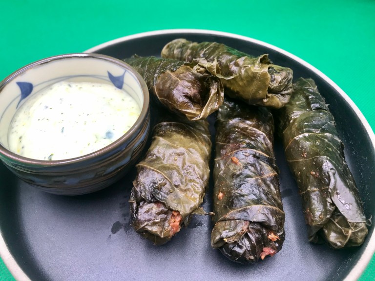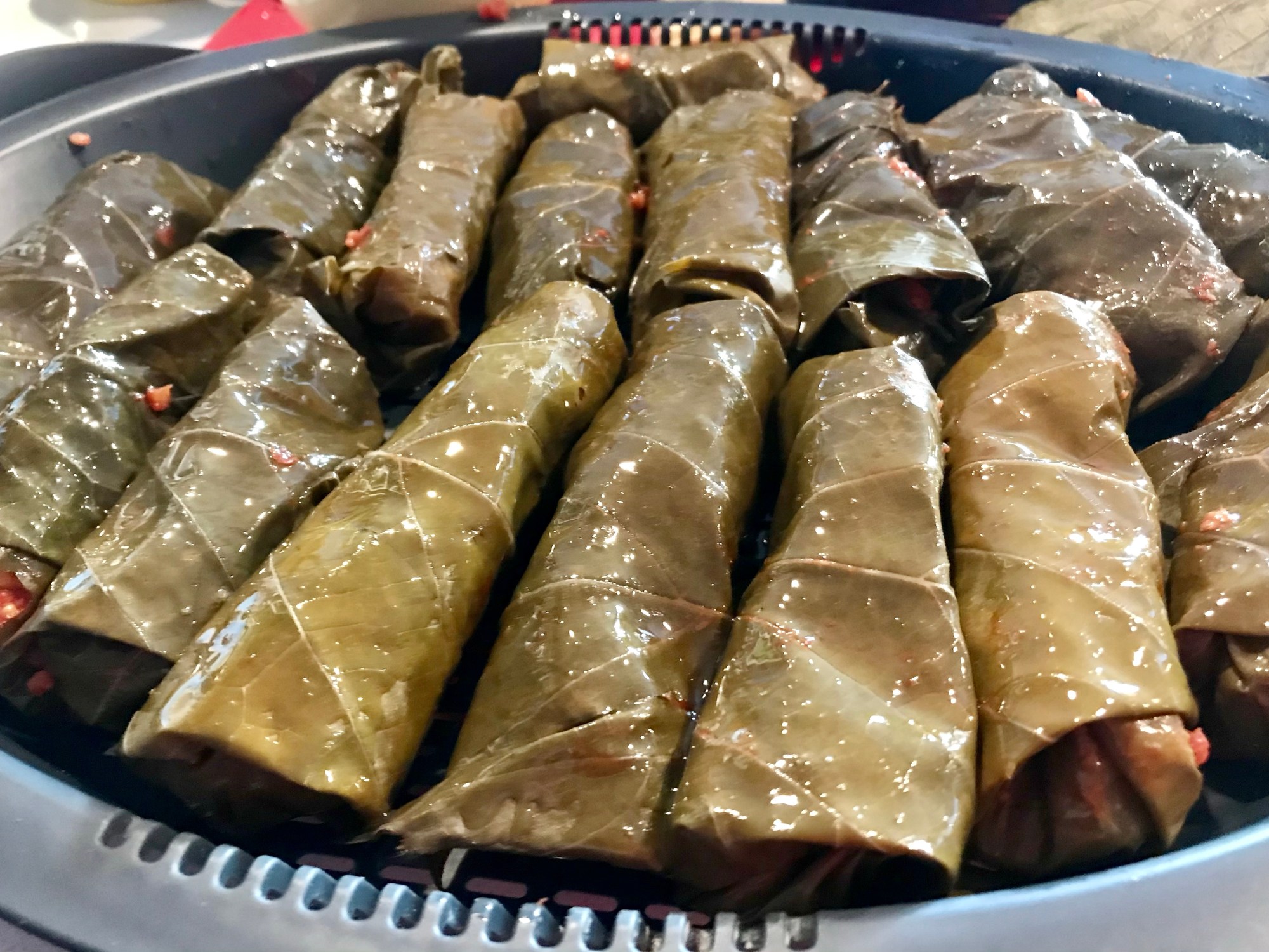 Poser les feuilles de vigne sur un plan de travail, côté nervures vers le haut et la queue de la feuille vers vous. Les huiler à l’aide d’un pinceau de cuisine, mettre 1 c. à soupe de farce au bas de la feuille, replier les bords vers l’intérieur et rouler vers le haut en serrant bien. Huiler de nouveau les feuilles ainsi farcies, les poser sur le plateau vapeur et insérer ce dernier dans le Varoma.