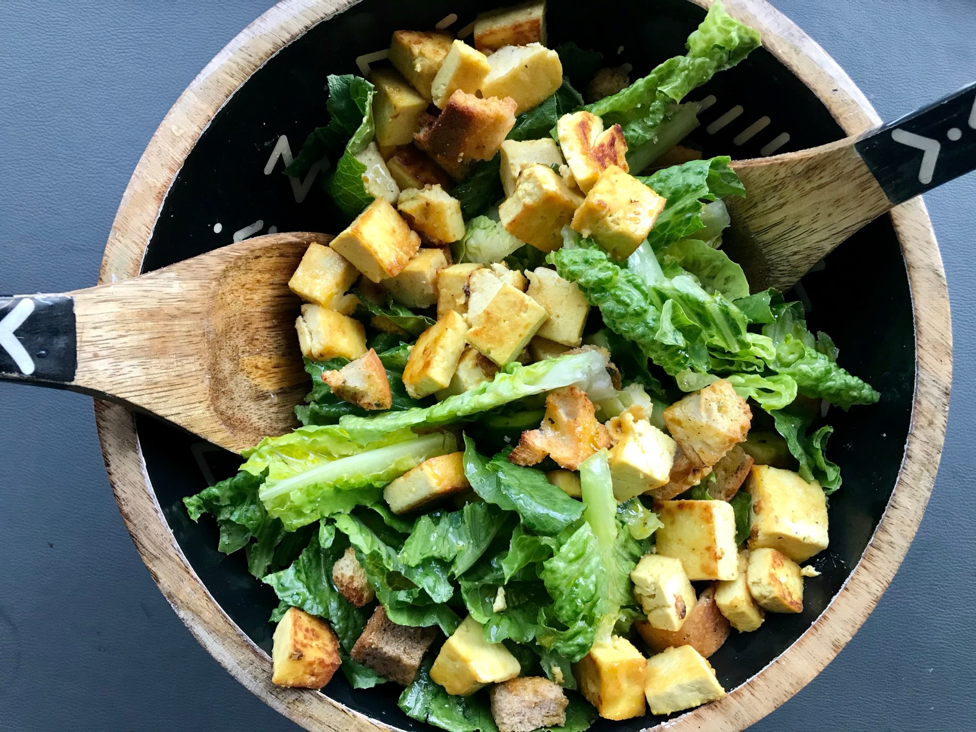 Dans un saladier, mélanger la laitue, le tofu, le concombre et la menthe. Ajouter les croûtons. Poivrer au goût et verser un filet d’huile d’olive.