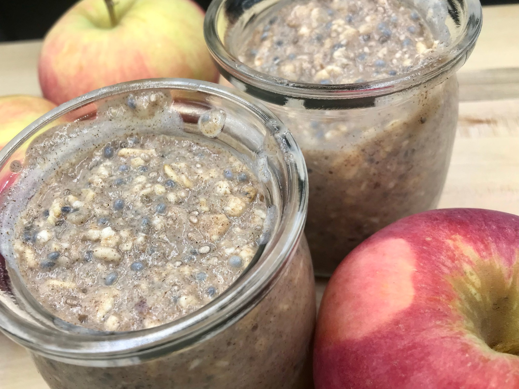 Mettre dans le bol 200 g de lait, 200 g de yogourt, 200 g de compote de pomme, 80 g de sirop d’érable, 30 g de graines de chia, 50 g de petits flocons d’avoine, 50 g de gros flocons d’avoine et 1 de c. à thé de cannelle moulu. Mélanger 10s/ Sens Inverse/ vitesse 3.