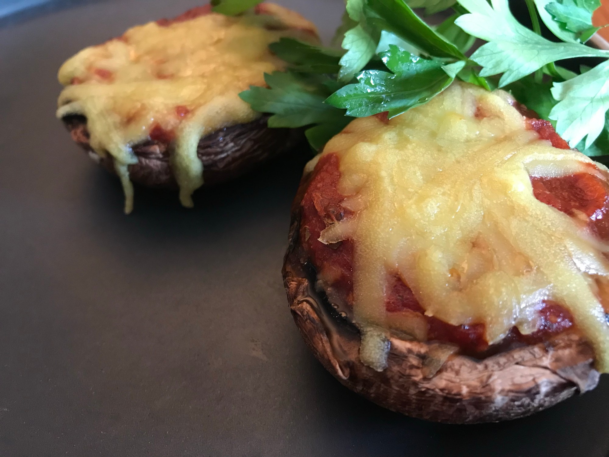 Recouvrir chaque champignon de sauce tomate et garnir de fromage végétal.