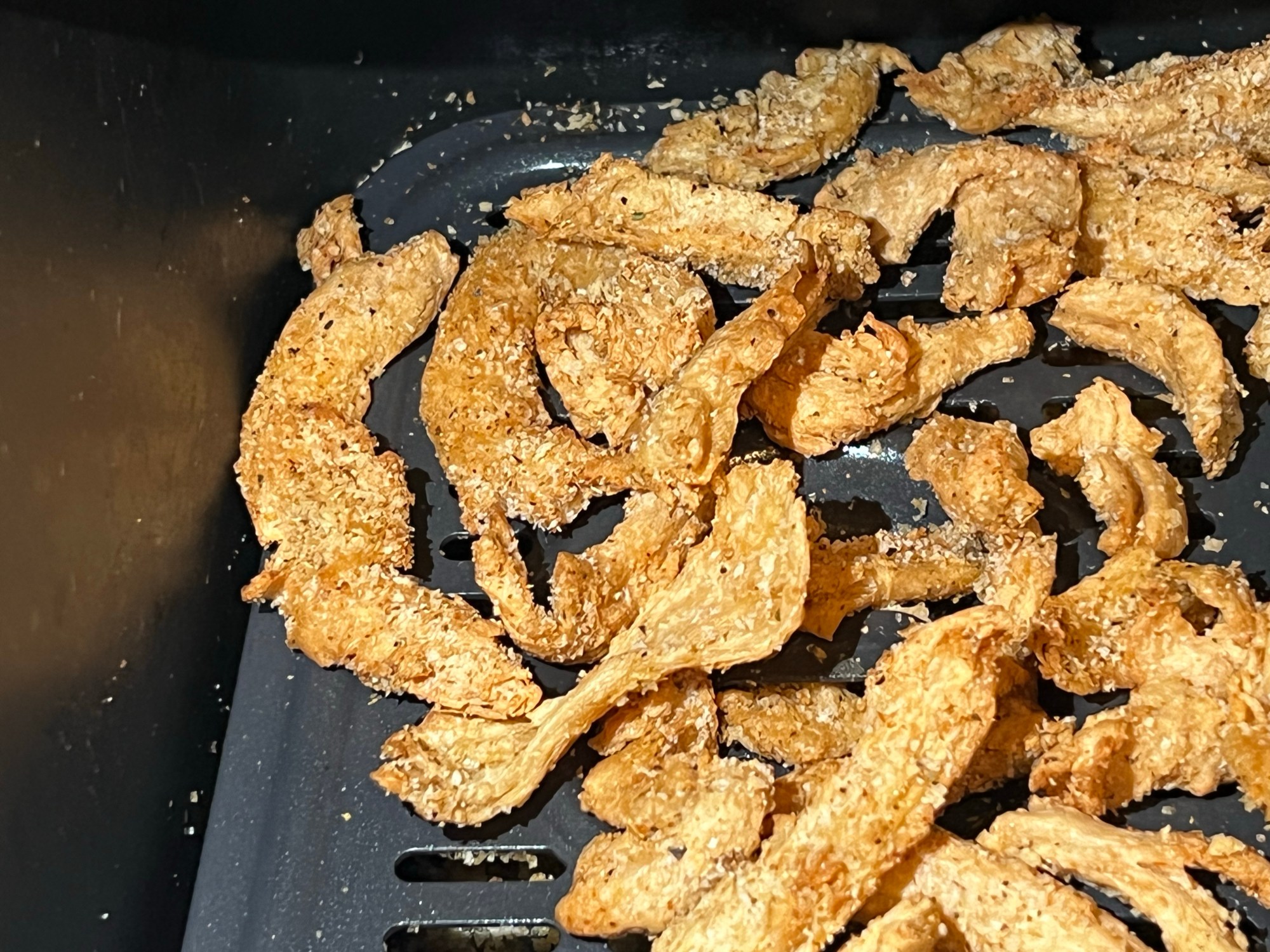 Mettre les lanières de soja panées dans une friteuse à air et faites cuire à 380 degrés pendant 5 minutes. Secouer et cuire 5 minutes de plus.