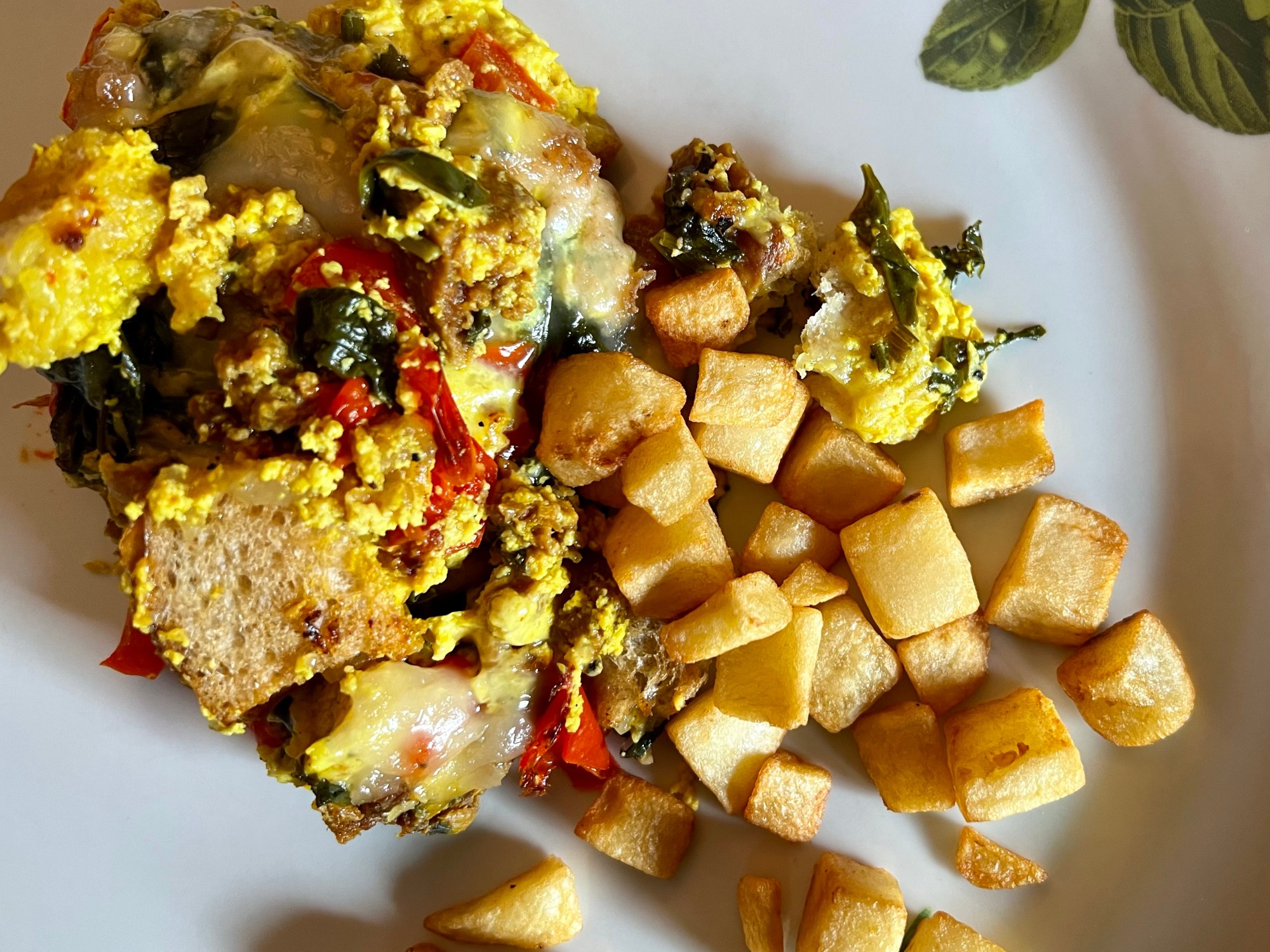 Verser le mélange de tofu sur le dessus. Remuer délicatement pour incorporer les ingrédients et enrober le tout de tofu.